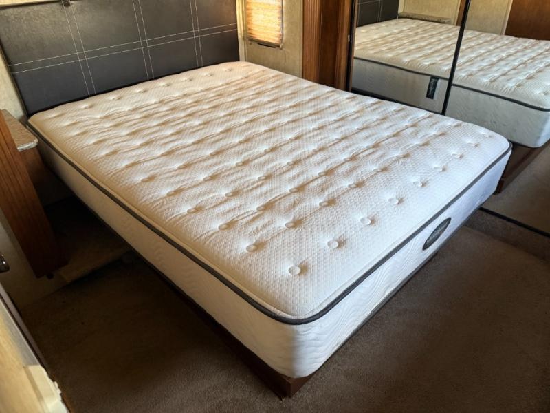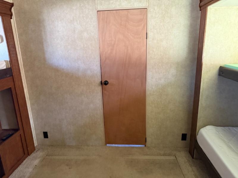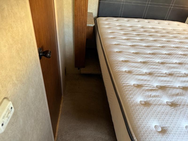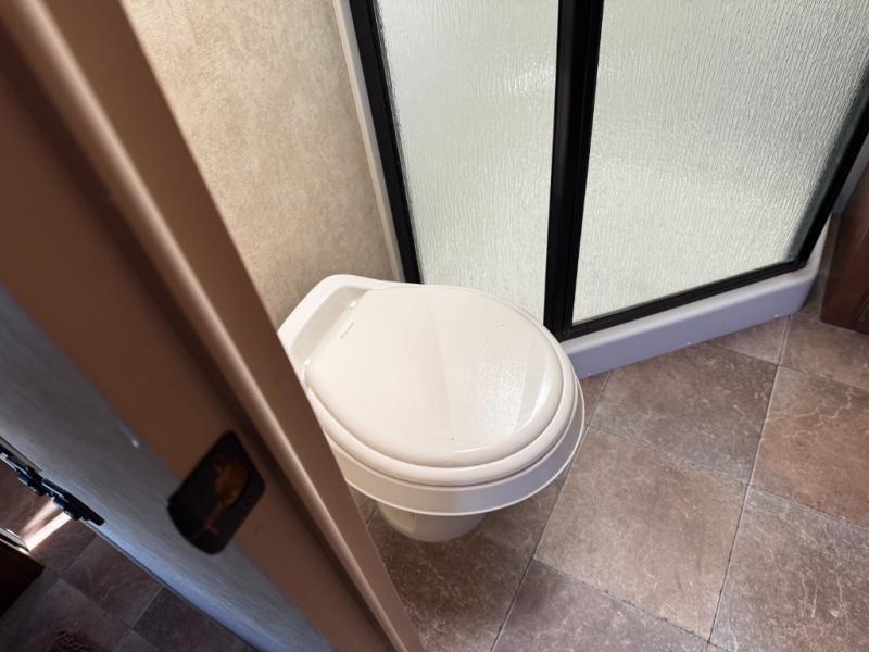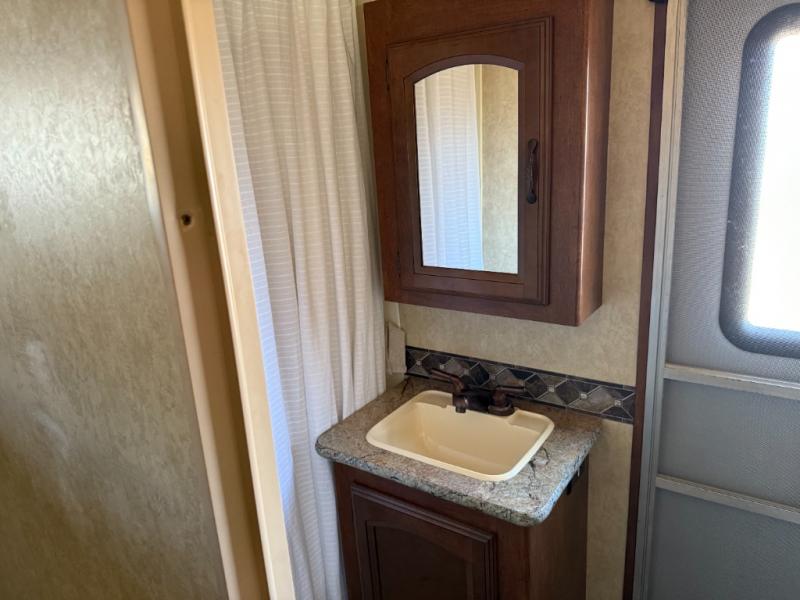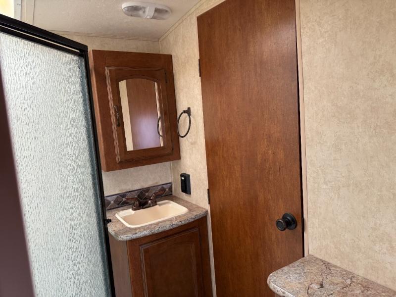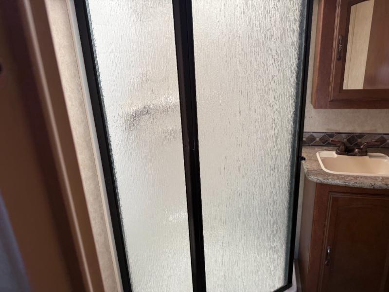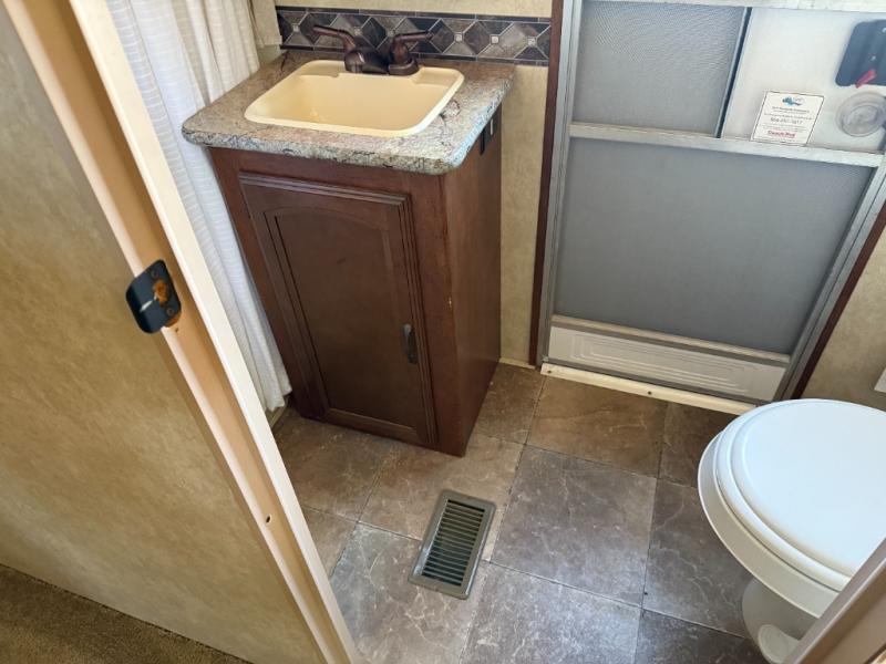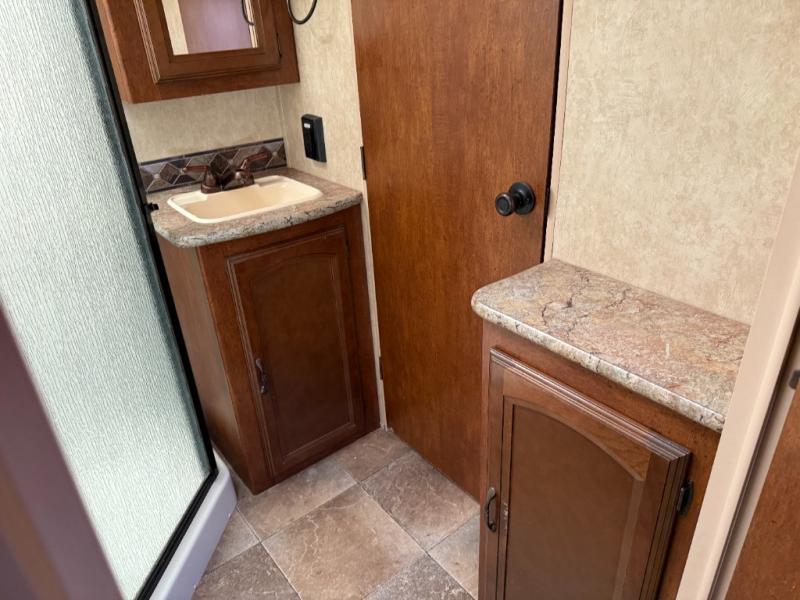 As you proceed through the front of the fifth wheel, and step up the stairs, the bathroom is on the left. Inside the bathroom you will find a toilet, neo-angle shower, sink, medicine cabinet, and linen cabinet. There is also a private entrance from the bathroom into the bedroom.