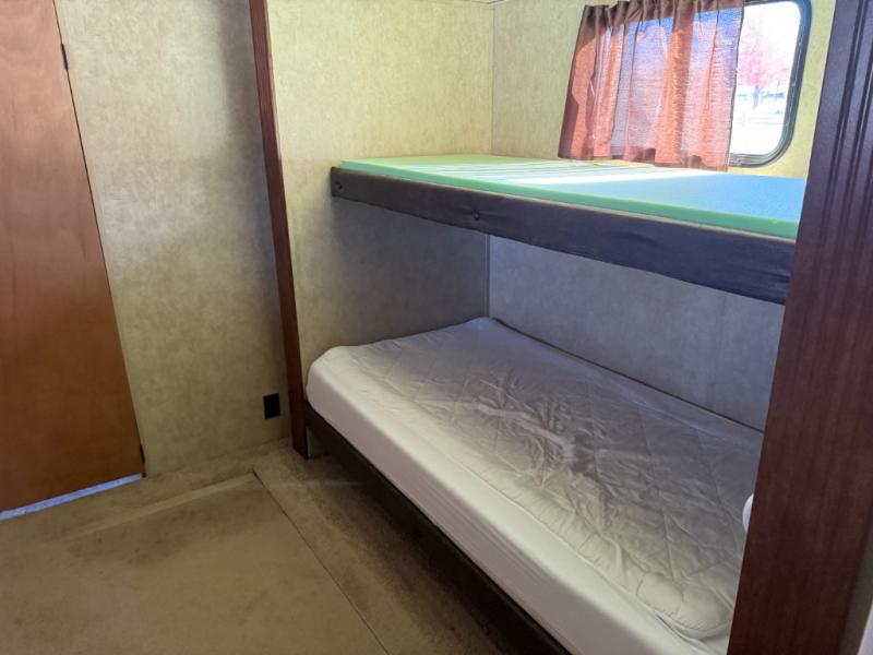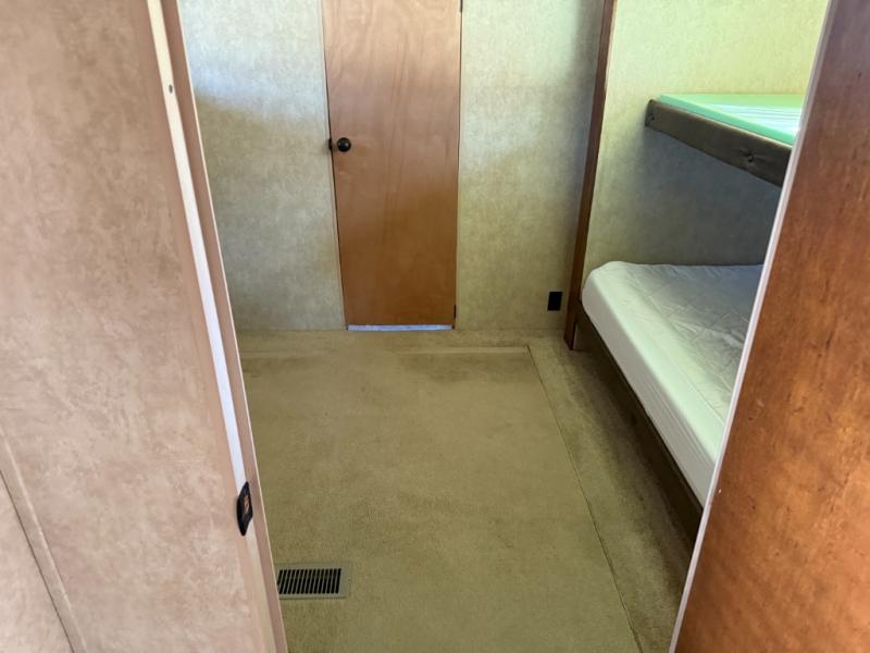 The bunk house has two slides. One slide offers a set of bunks, while the other slide has a bunk on top and an entertainment center with a wardrobe below the bunk. There is an additional wardrobe next to the slide with the entertainment center.