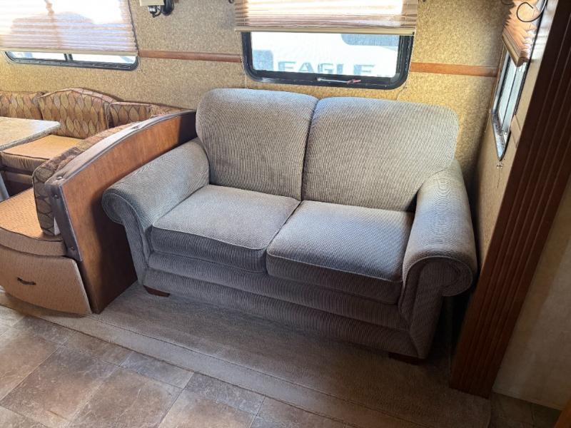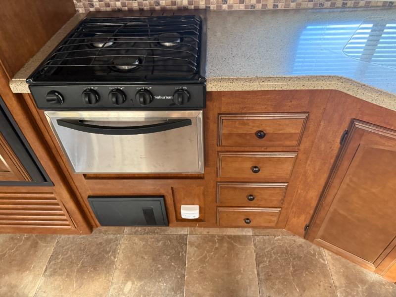 To the left of the entrance is a pantry, refrigerator, three burner range, microwave, and double kitchen sink. On the opposite side of the fifth wheel you will find a slide with a u-dinette and a hide-a-bed sofa. Next to the sofa is an entertainment center.