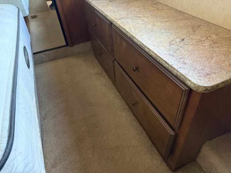 The front bedroom has a king bed slide. Along the front wall you will find a full wall wardrobe with shelves. There is also a large dresser.
