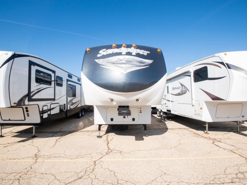 More Pictures Coming Soon!!The 365SAQB Sandpiper fifth wheel offers four slides, a rear bunk house, and a bath and a half.