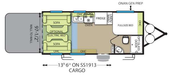 A rear ramp door on the Stealth SS1913 toy hauler travel trailer leads to over 13' of cargo space. The rear also holds a sofa with a table in front of it on each side wall. An optional electric bed may be added.