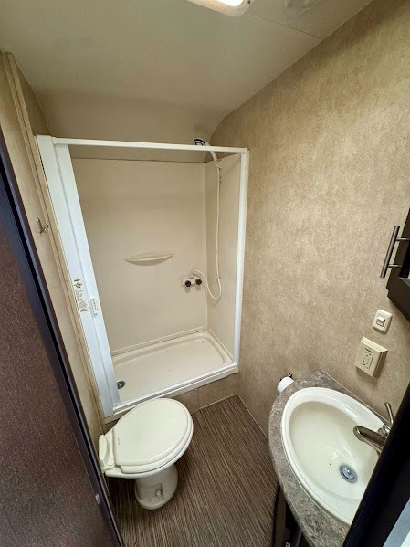 A front corner bathroom includes a corner vanity sink, toilet and a shower with optional glass door.