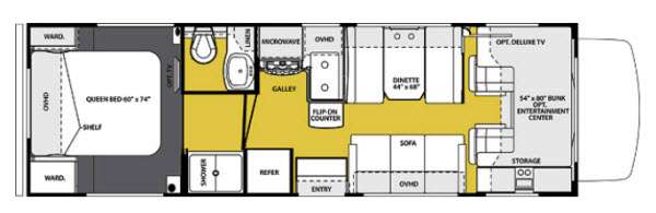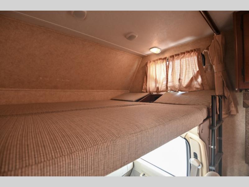 Sunseeker Motor Home, Rear Queen Bed w/Wardrobe, Nightstand/Shirt Closet, Shower, Private Toilet Area w/Lav., Med. Cab., 3-Burner Range, Microwave, Double Kitchen Sink, Dinette, Refrigerator, Sofa, Cab Bunk, Overhead Cabinets Throughout & Much More. Available Options May Include: Entertainment Center Above Cab, TV in Bedroom, Deluxe TV Above Cab.