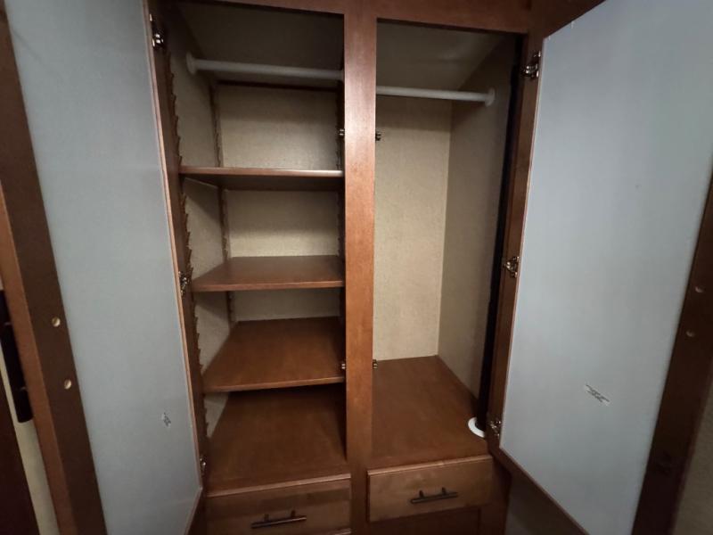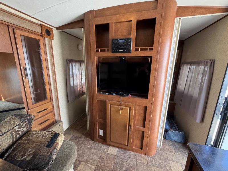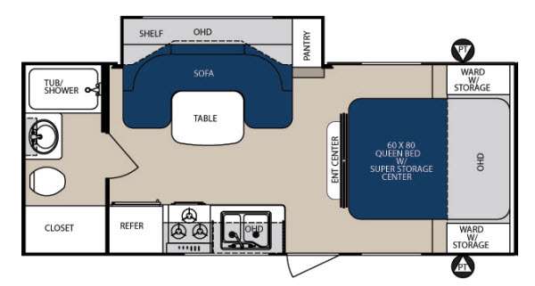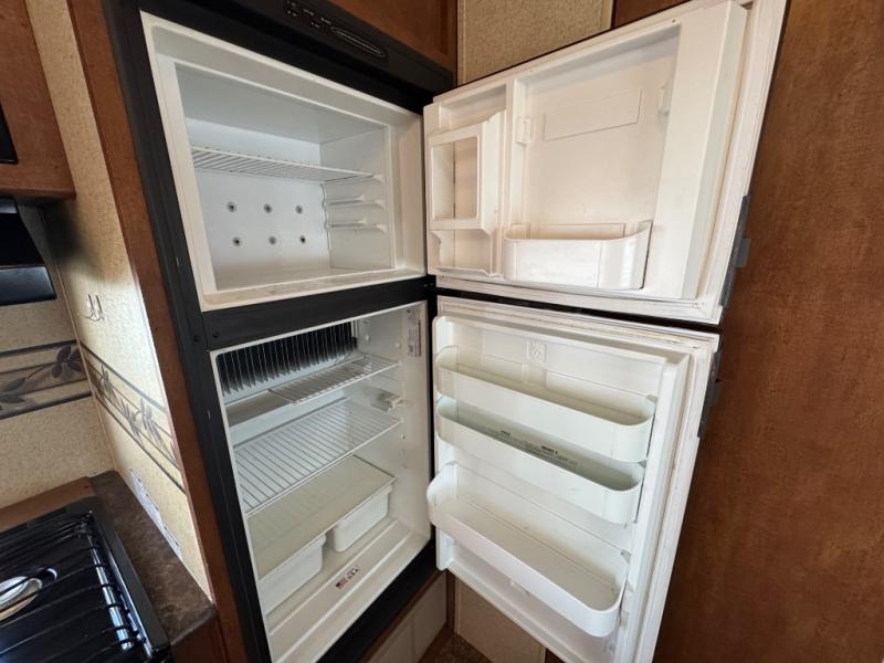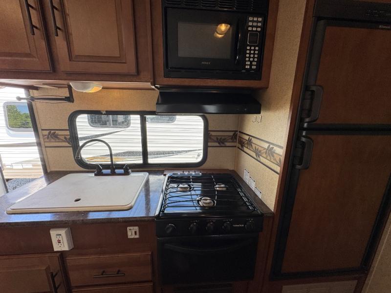 As you enter the travel trailer, to the left is a double kitchen sink, three burner range, and refrigerator. The opposite side of the trailer offers a slide with sofa, pantry, and a table. You are sure to enjoy the entertainment center.