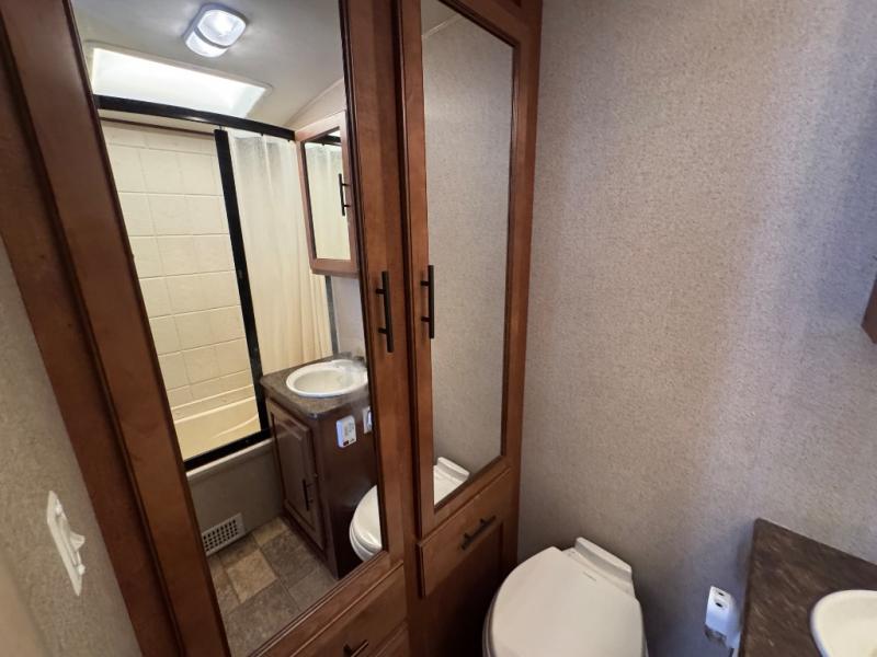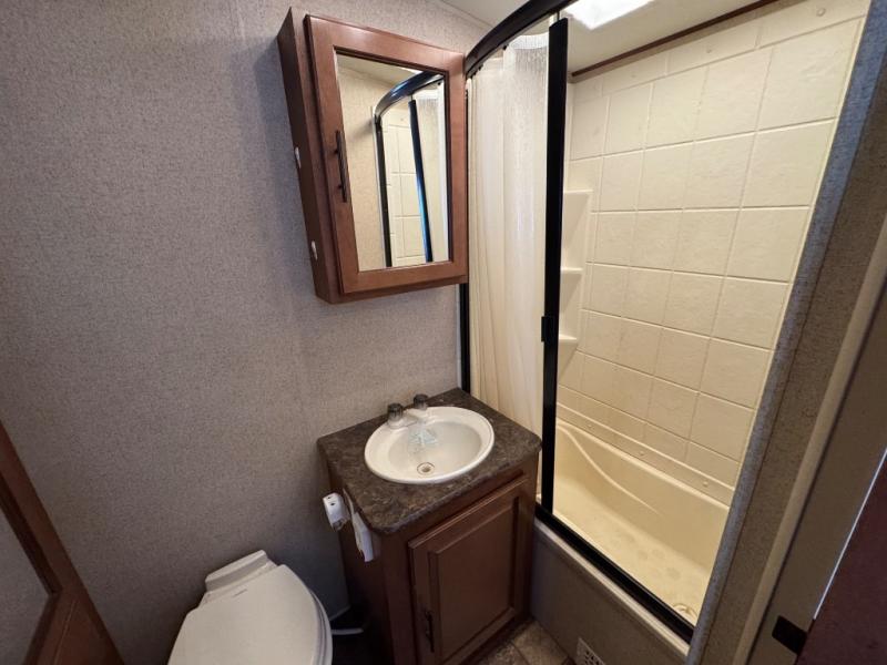 In the rear you will find a tub/shower, sink, toilet, and closet.