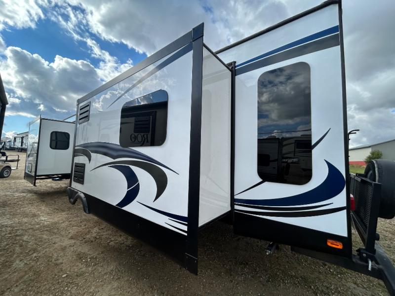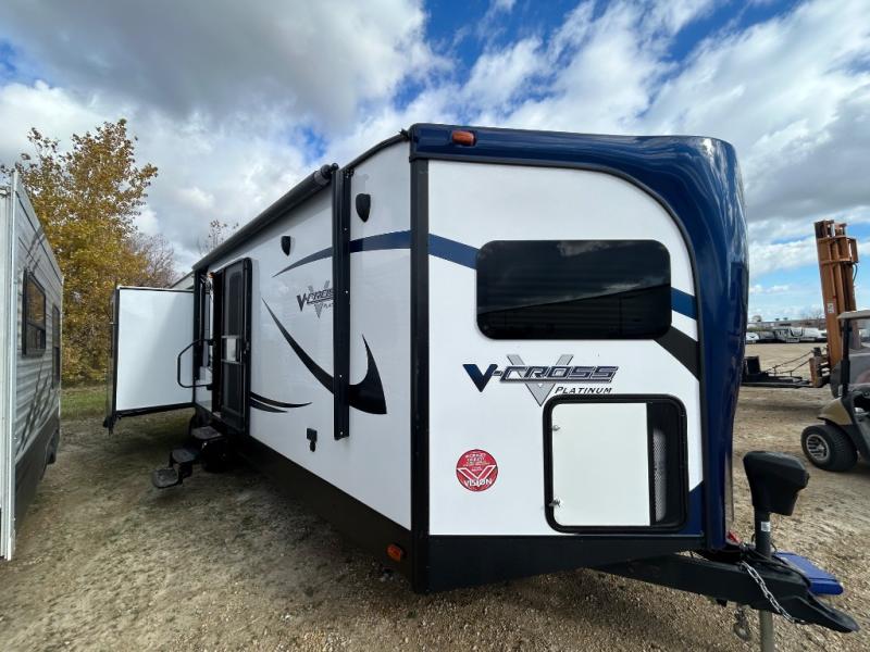 The V-Cross Platinum 30VSK travel trailer by Forest River offers triple slides and a rear living area.