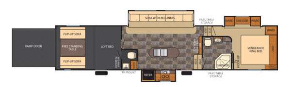 The 377V Vengeance toy hauler fifth wheel by Forest River offers much room for friends and family with a cargo area, loft, and front bedroom, and also features a bath and a half.