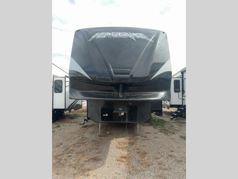 The 312A Super Sport Vengeance toy hauler fifth wheel by Forest River features one slide and plenty of cargo space.