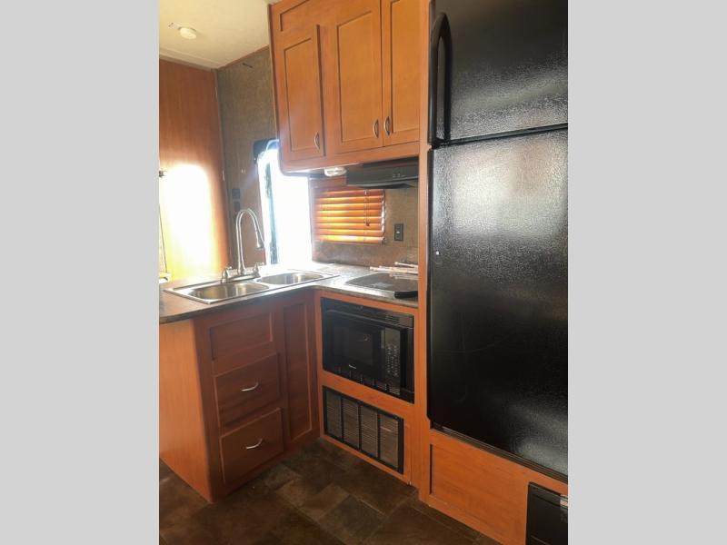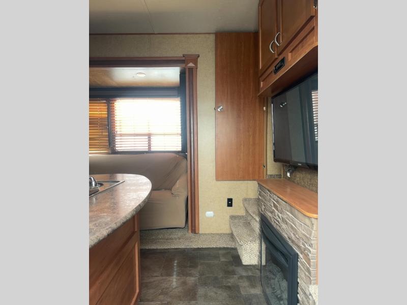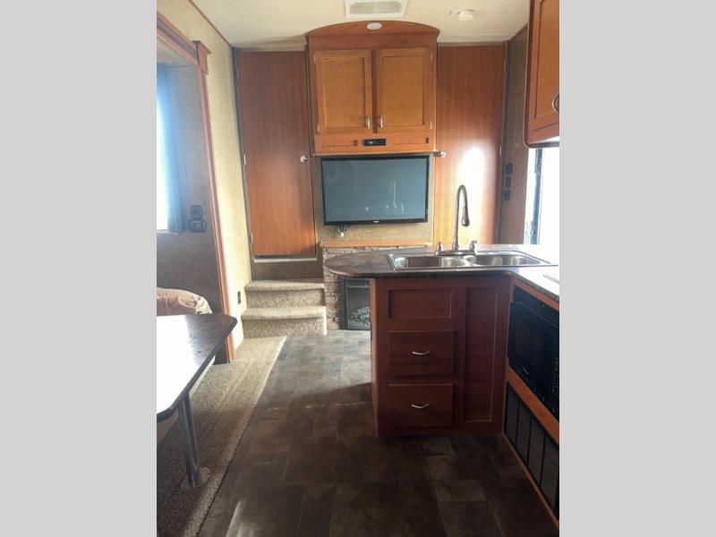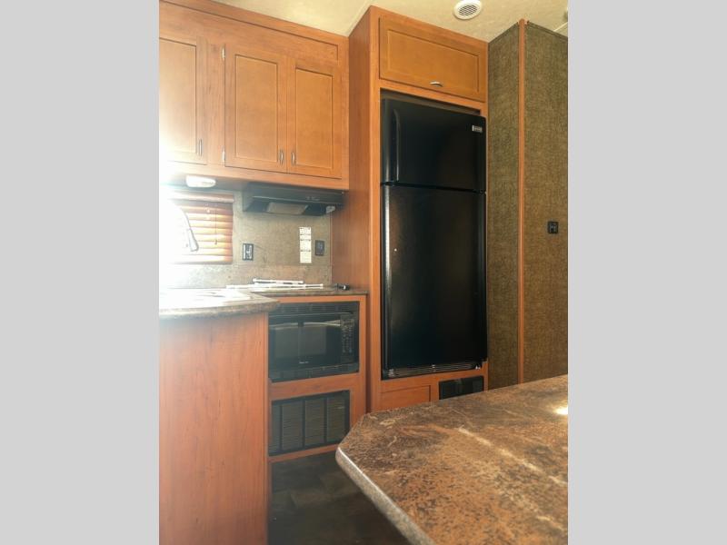 The kitchen and living area offers one slide. You will find a comfortable sofa with recliners slide. You can relax on the sofa and enjoy the entertainment center and fireplace. On the opposite side of the fifth wheel there is a refrigerator, three burner range, microwave, and double kitchen sink. In the corner of the kitchen is a large pantry for your food items.