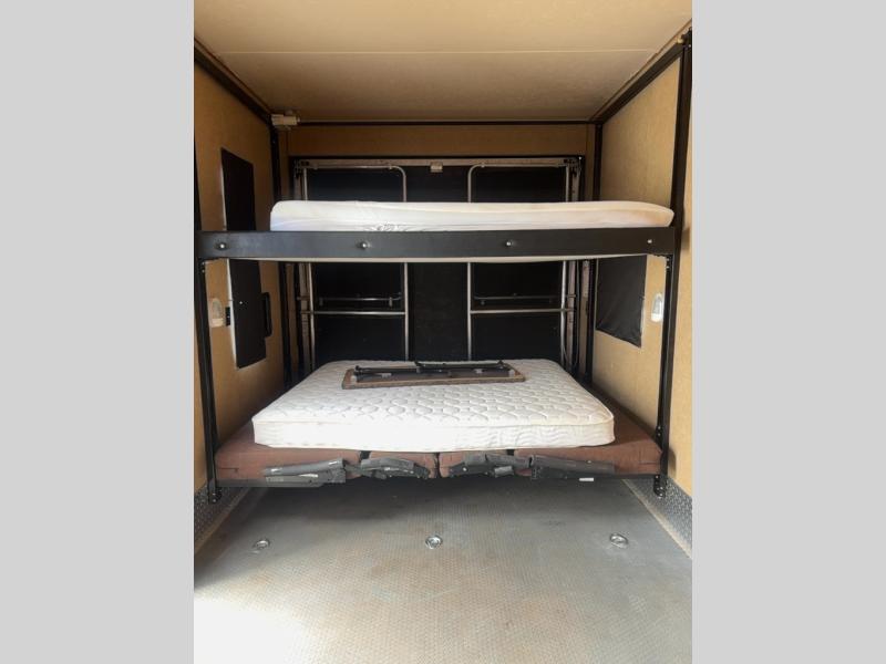 In the cargo you will find a flip-up sofa and free standing table. There is easy loading and unloading of your off-road toys with the large rear ramp door. In the corner you will find a tv mount.