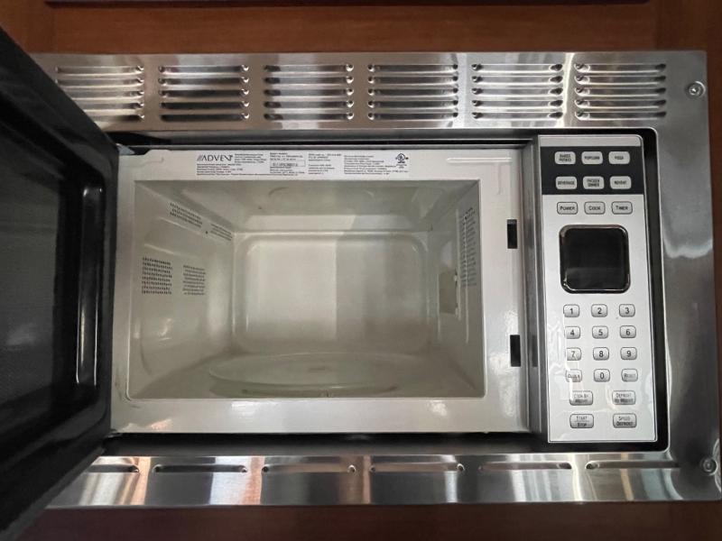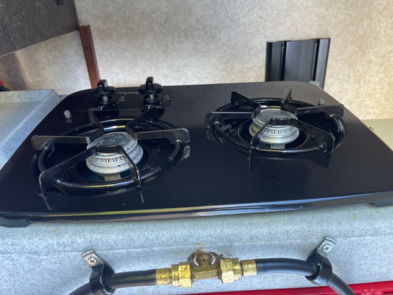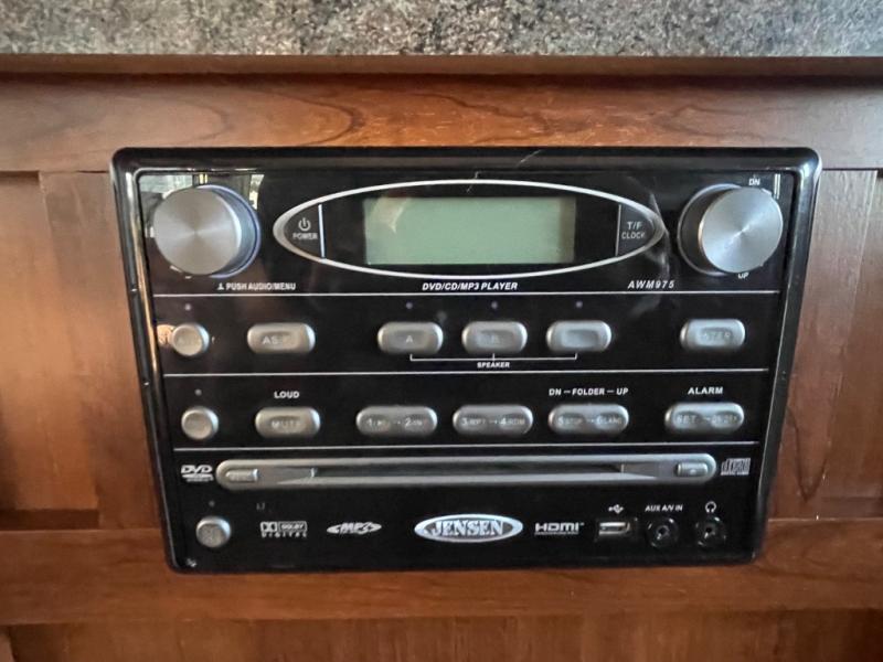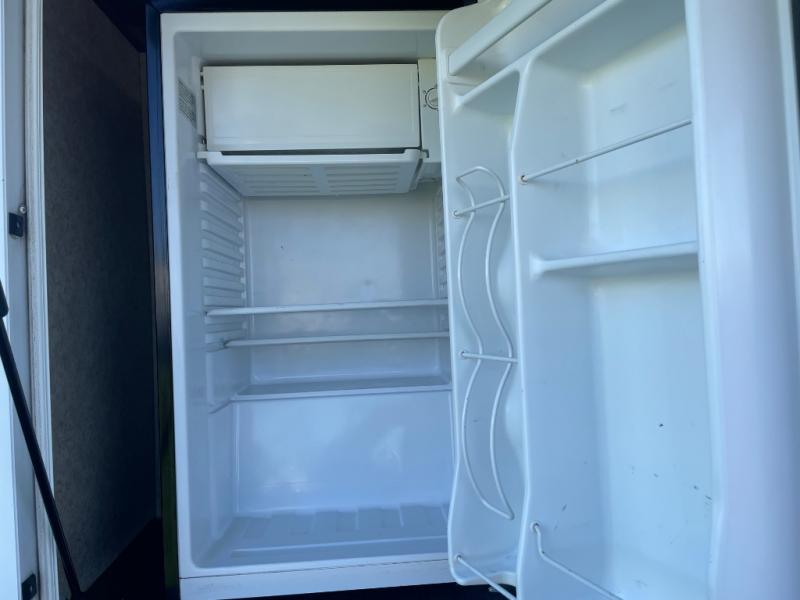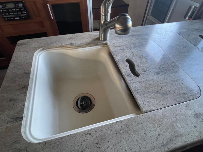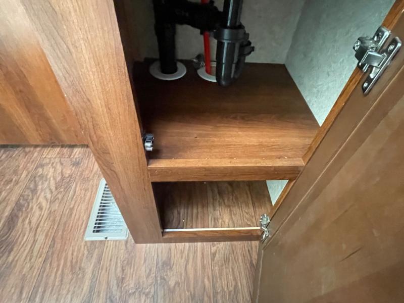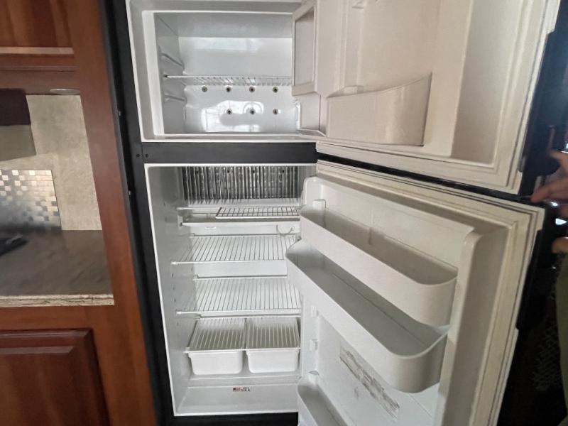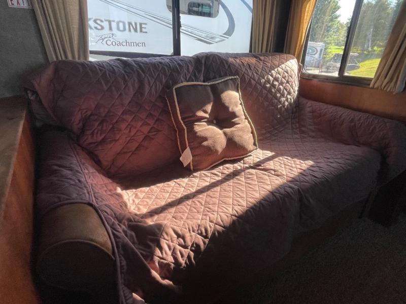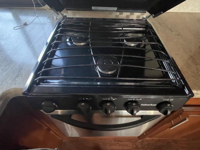 As you enter the kitchen and living area you will find a pantry, refrigerator, three burner range, microwave, and double kitchen sink on an l-shaped counter. The opposite side has a u-shaped dinette and air mattress hide-a-bed sofa slide. While in the kitchen and living are you can easily view the 40" Toshiba tv.