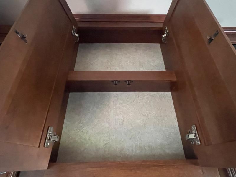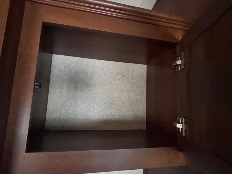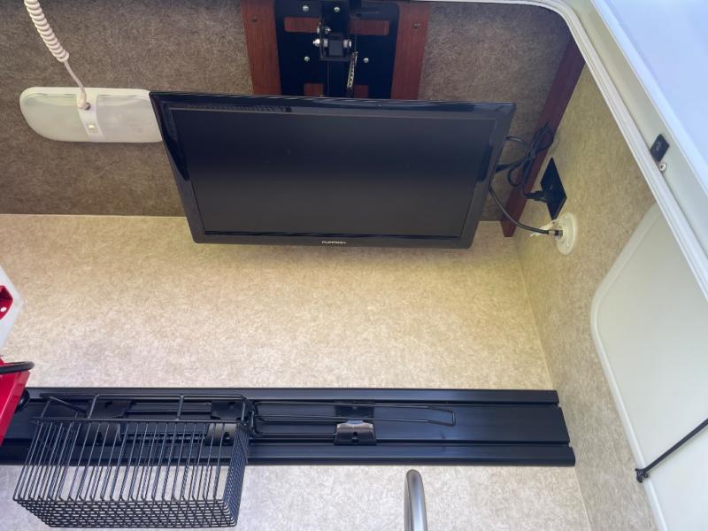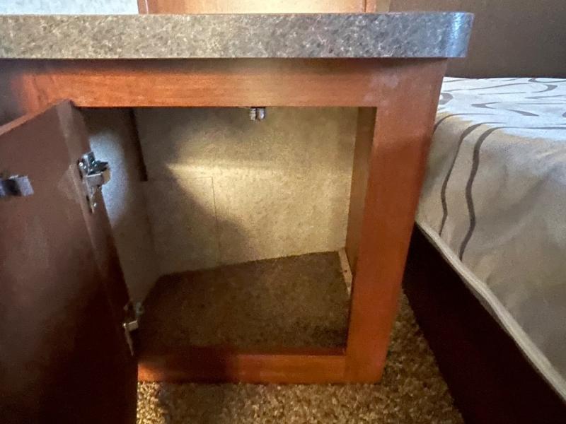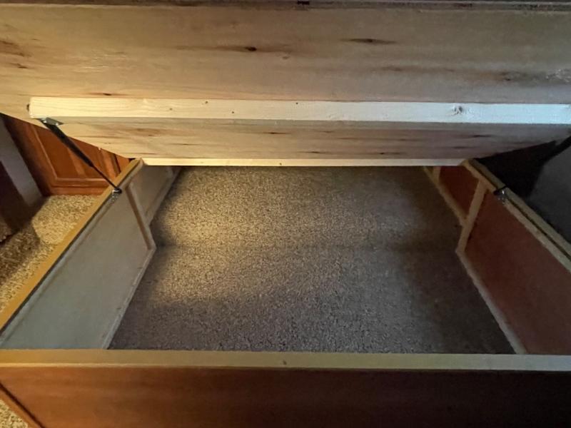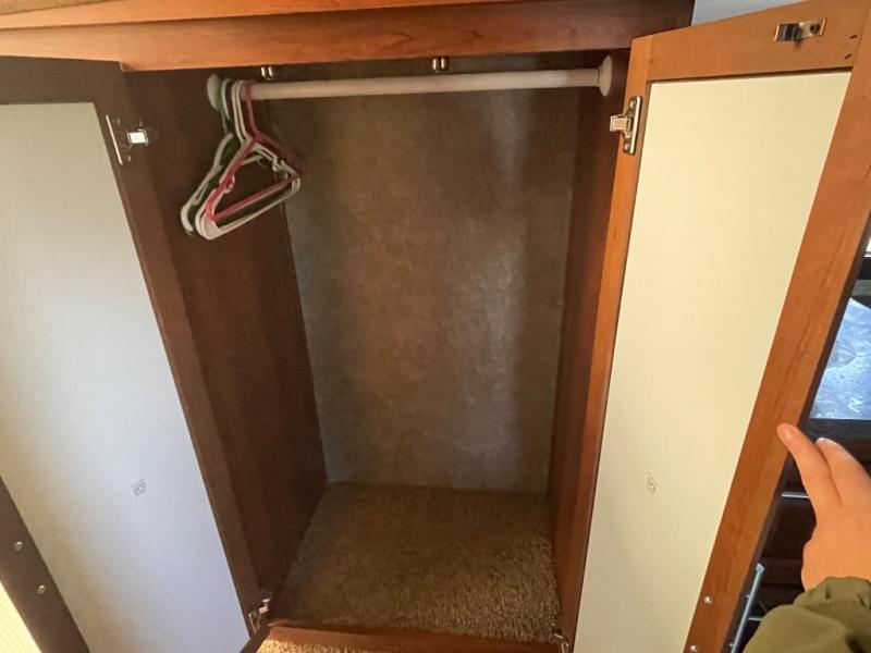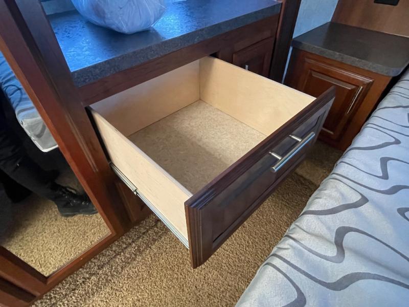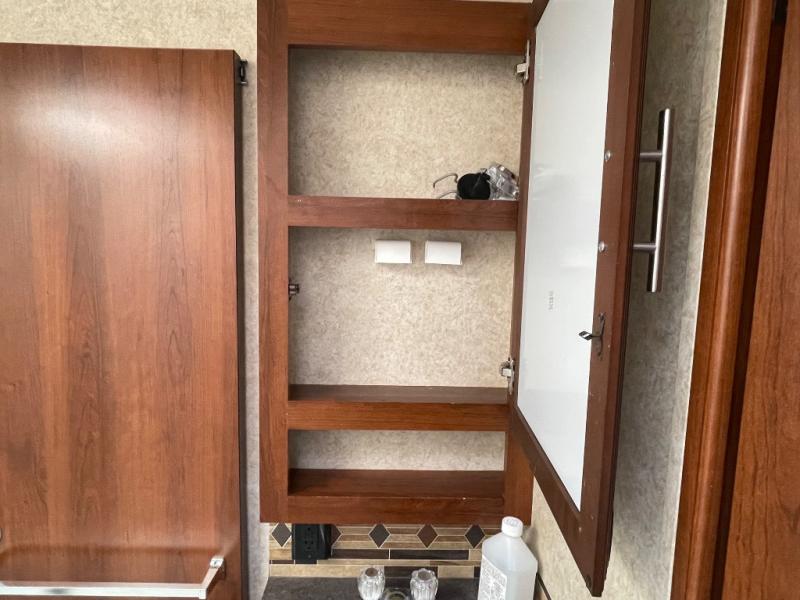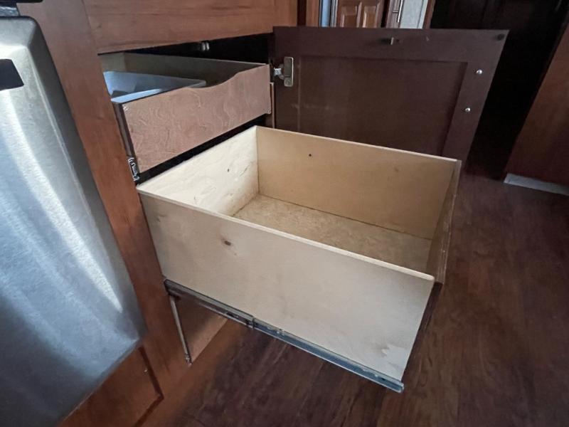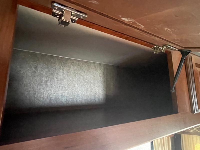 There is plenty of interior storage with the overhead cabinets, as well exterior storage with a pass through storage with slam latch door, as well as a stow and go door.