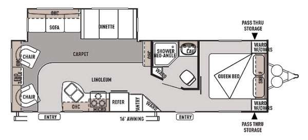 The Wildwood 27RLSS travel trailer by Forest River offers a single slide, two entrances, and a rear living area.