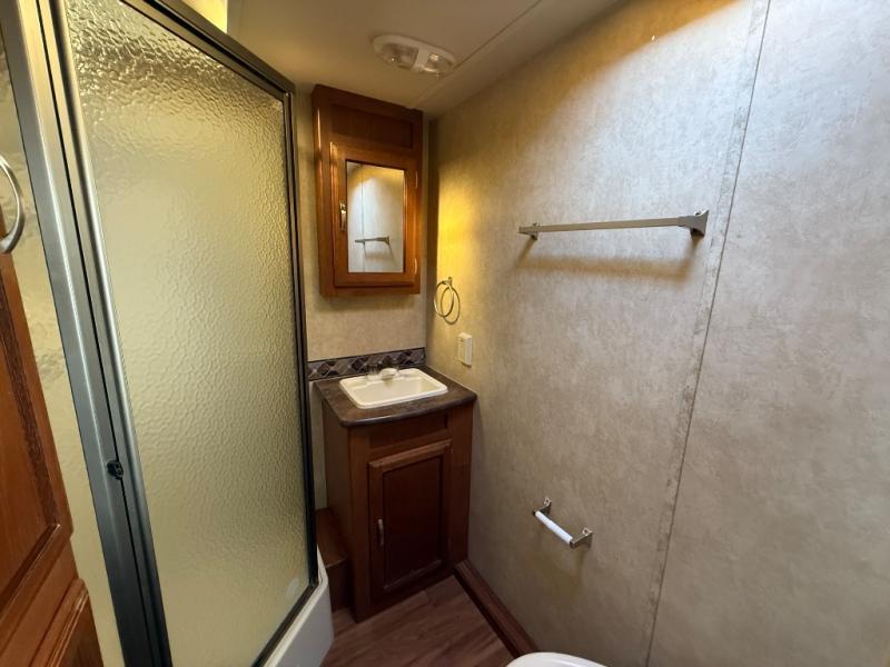 You will find plenty of overhead cabinets throughout the trailer as well as an exterior pass thru storage area.