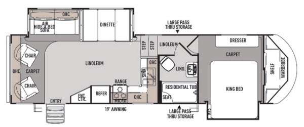 There are plenty of overhead cabinets throughout the fifth wheel, as well as a large pass thru storage.