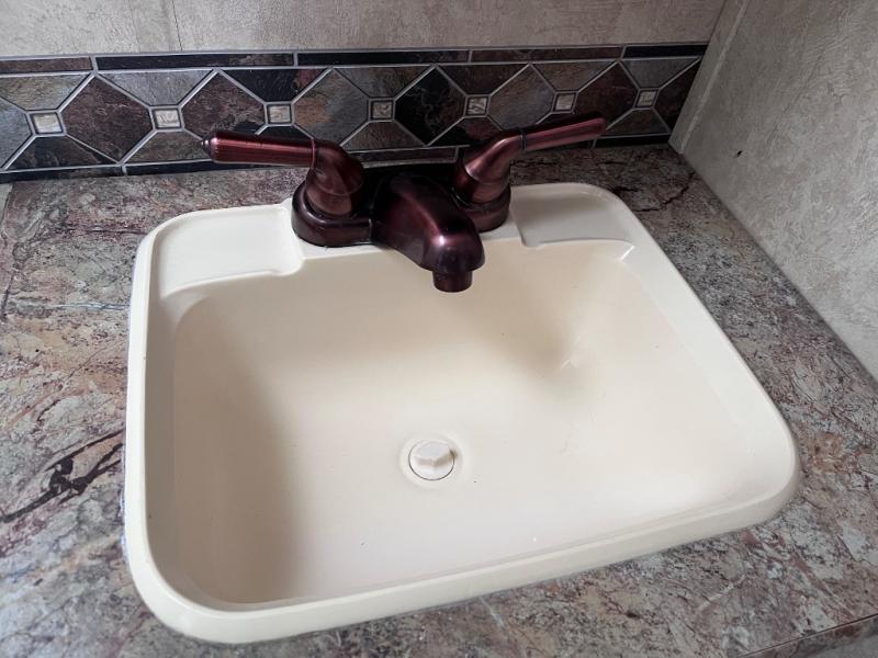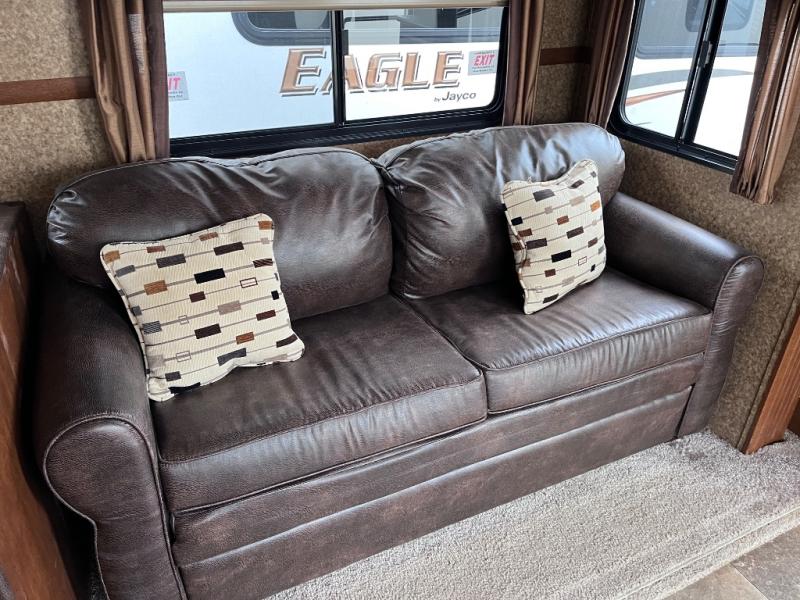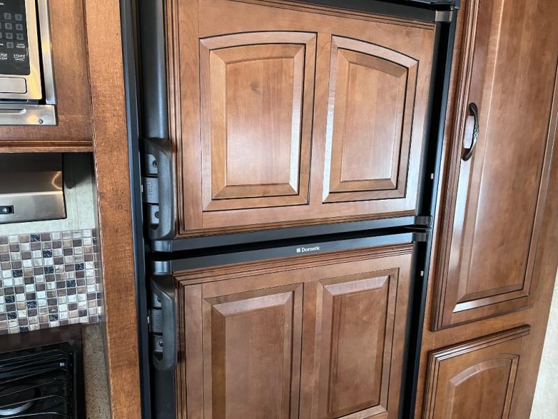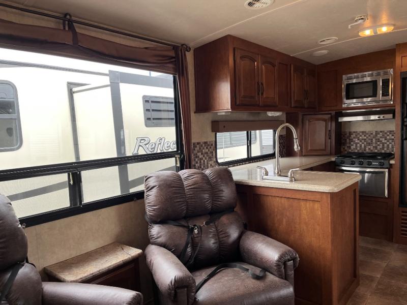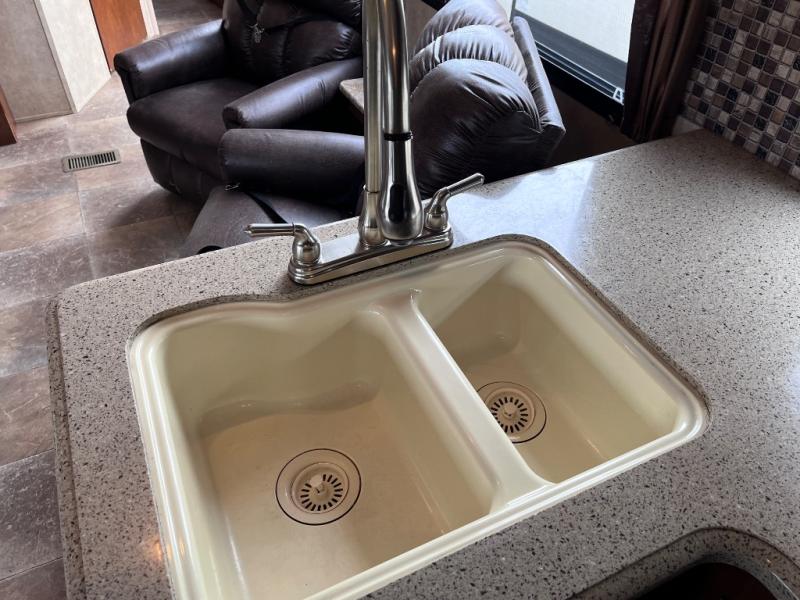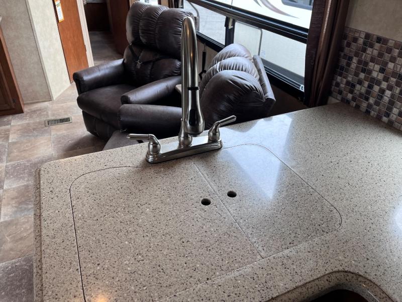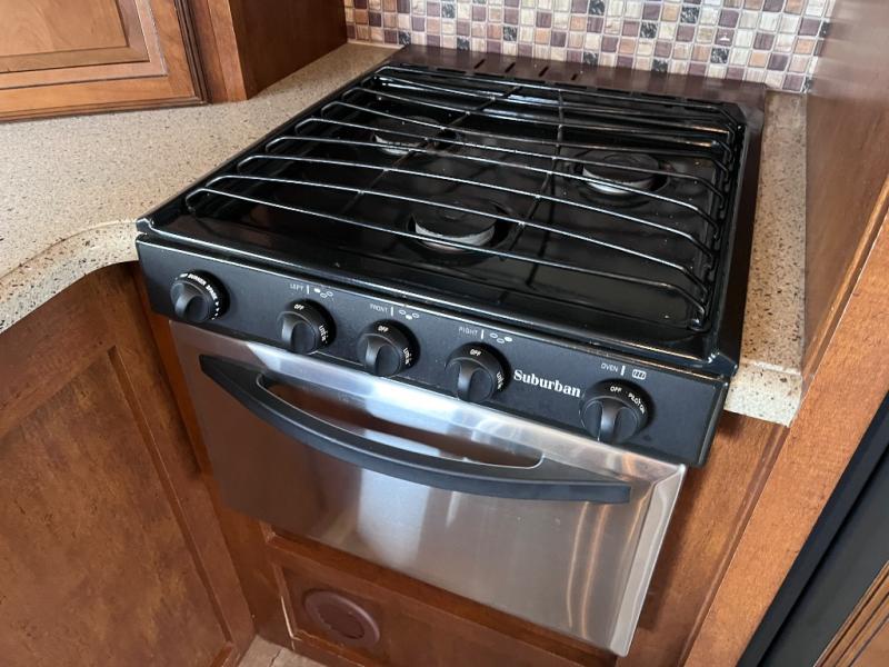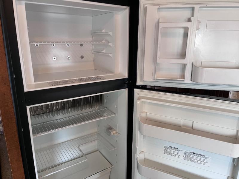 As you enter the travel trailer, to the left are two lounge chairs and an end table. The kitchen offers a double kitchen sink, lots of counter space, a cabinet, microwave, three burner range, refrigerator, and pantry. The slide has a dinette and hide-a-bed sofa. In the corner of the living area you will find an entertainment center.