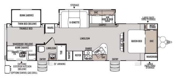 There are plenty of overhead cabinets throughout the travel trailer as well as a large pass thru storage area.