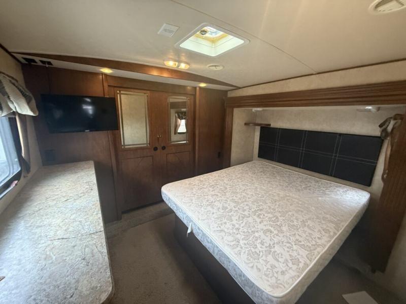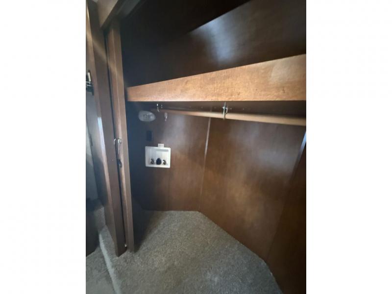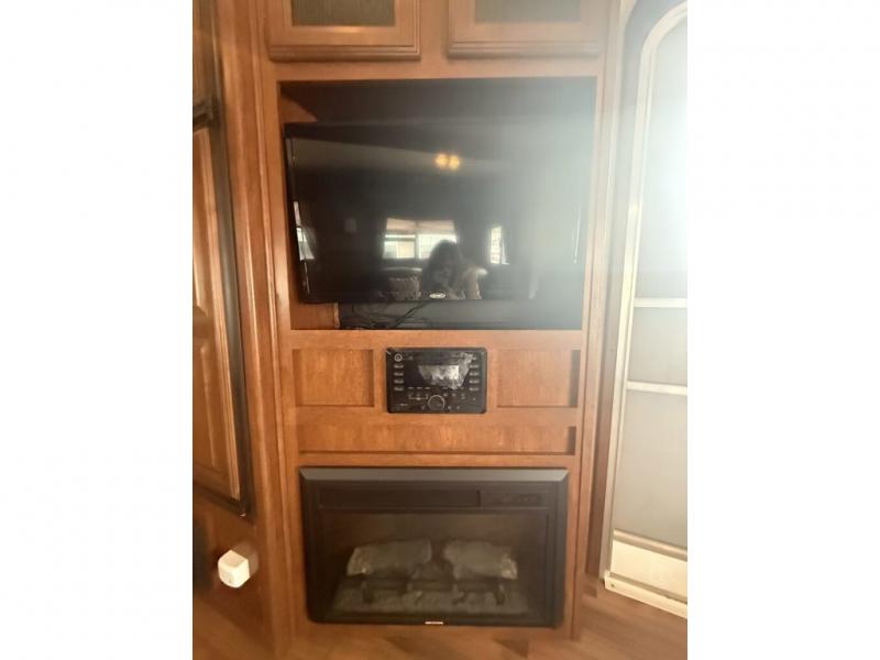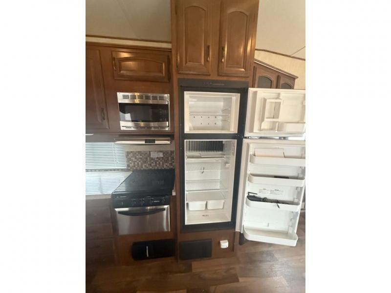 As you enter the fifth wheel, in the rear you will find two lounge chairs, and a slide with a air hide-a-bed sofa and dinette. The opposite side has an entertainment center, refrigerator, range, microwave, double kitchen sink, and lots of counter space.
