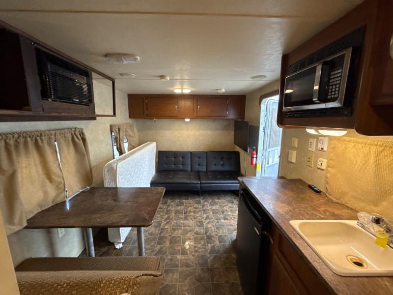 The main living area of the trailer offers a wardrobe, microwave, refrigerator, sink, two burner range, and pantry on one side of the trailer. The opposite side has a dinette.