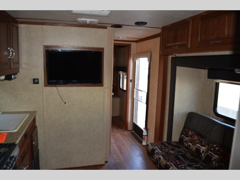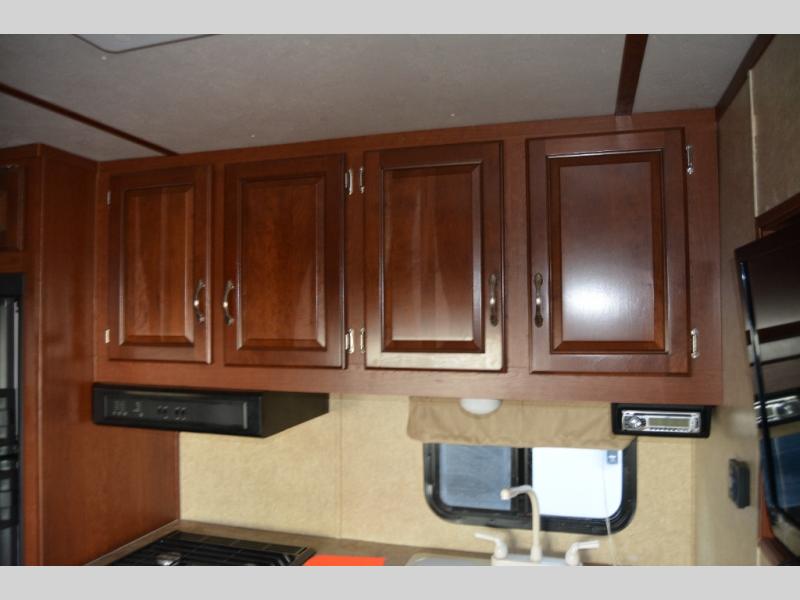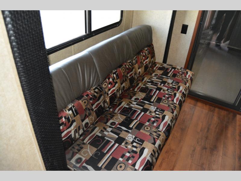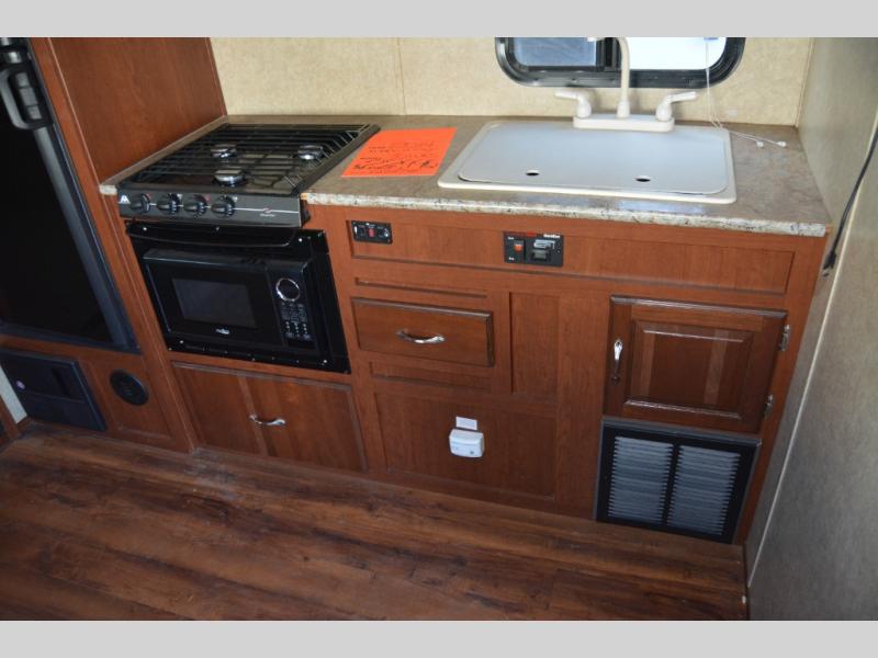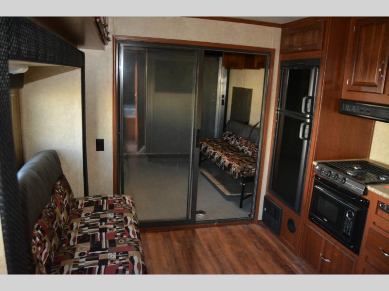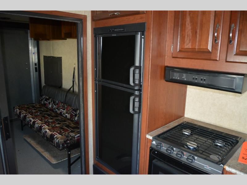 As you enter the travel trailer, to the left there is a sofa slide. On the opposite side of the trailer you will find a refrigerator, three burner range, microwave, and double kitchen sink.