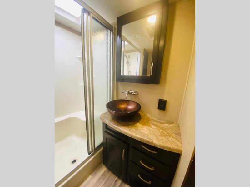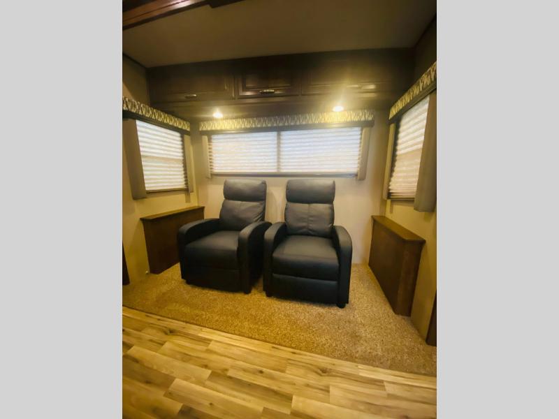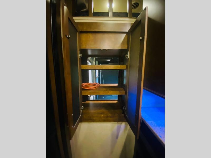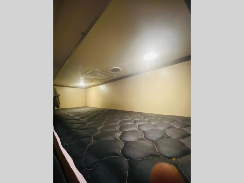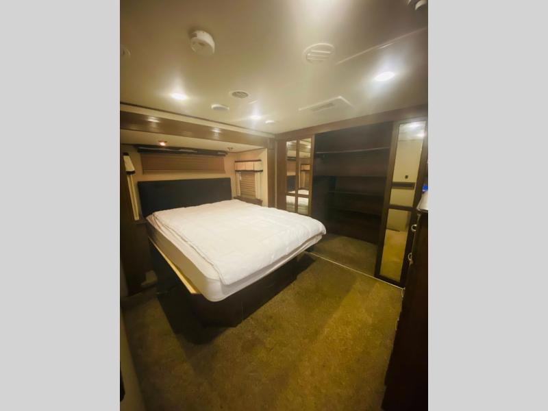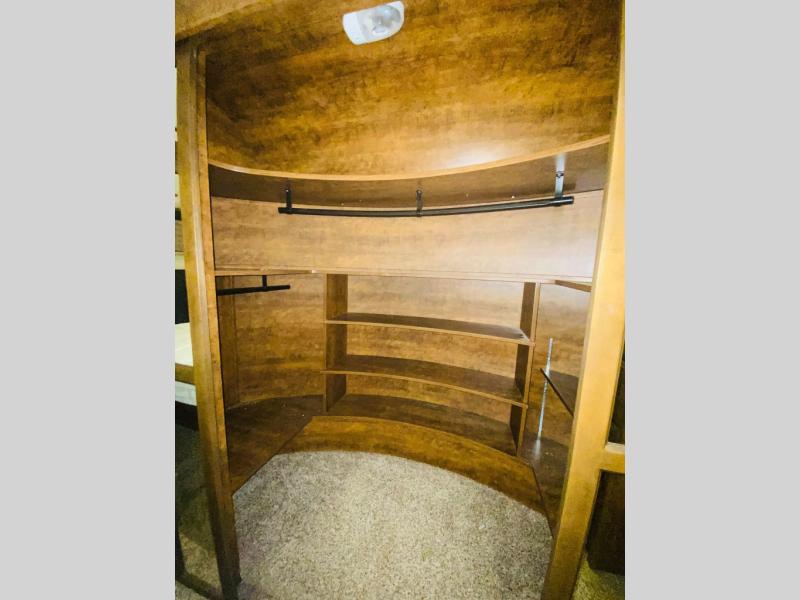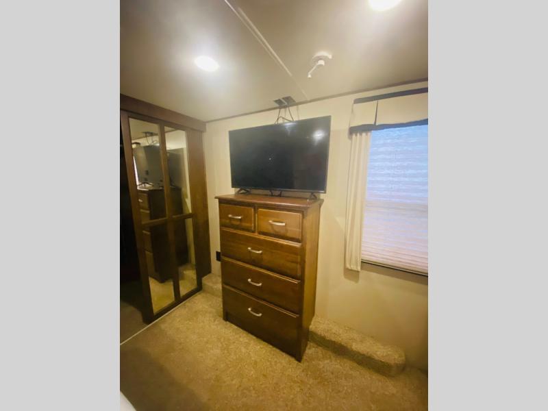 As you continue passed the bathroom down the hall you come to a front private bedroom with a comfy slide-out queen bed with a pull-out ottoman at the foot. Enjoy a spacious walk-in closet with shirt storage and washer/dryer prep space. There is also a dresser for more storage plus so much more.