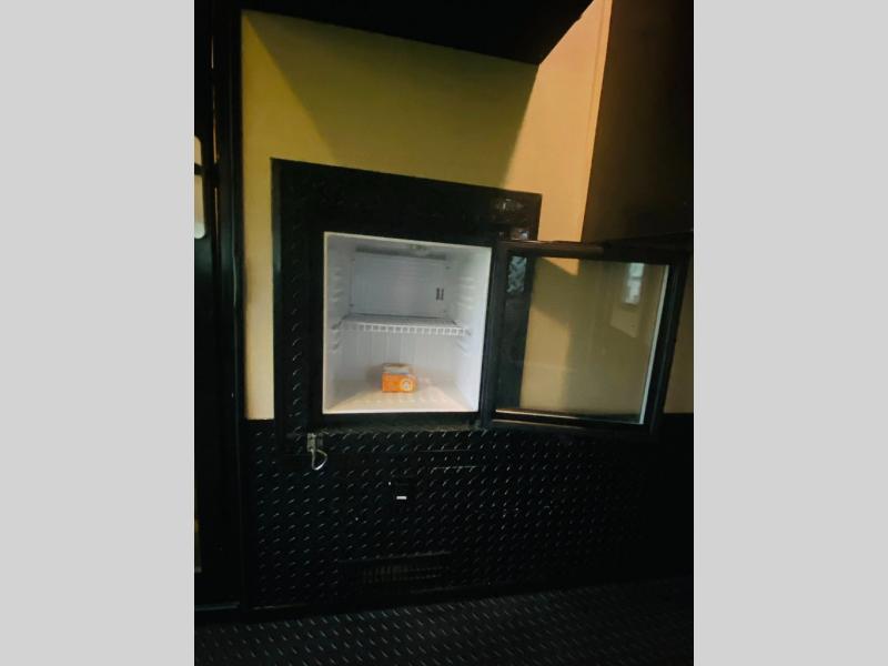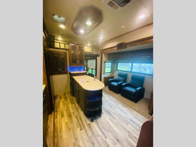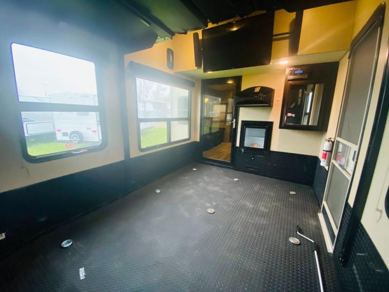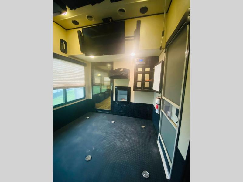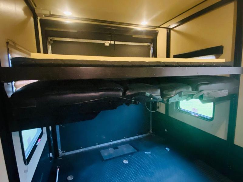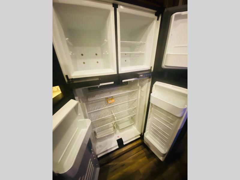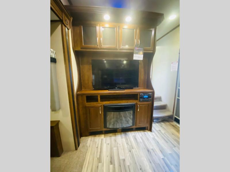 Enter the main kitchen and living area and find a counter peninsula with double kitchen sink for easy food prep and clean-up. There is a slide-out pantry, refrigerator, and three burner range. Opposite you will find a sofa slide-out with a stow-able table for dining. Enjoy a convenient entertainment center with LED television with fireplace below.