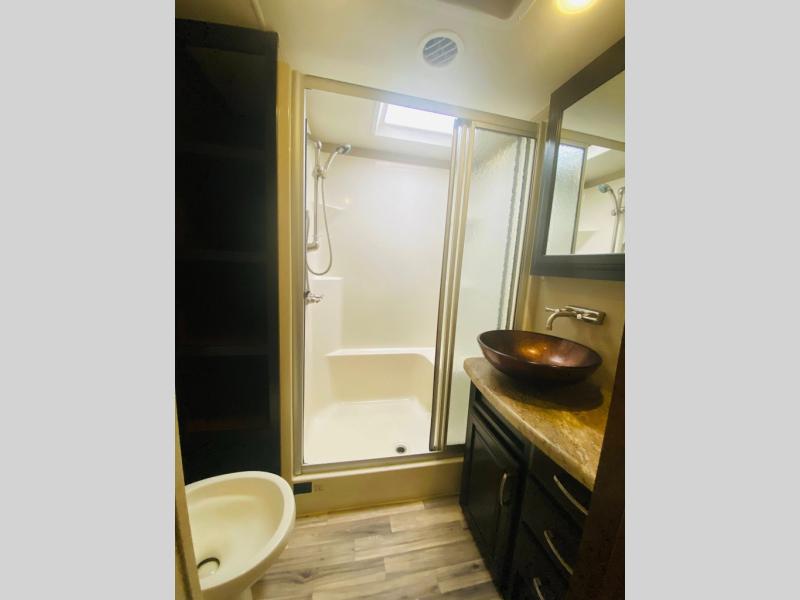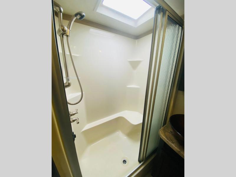 Step up to a convenient side aisle bath with large shower including built-in seat, toilet, and vessel sink with medicine cabinet for storage. There is also a linen cabinet too.