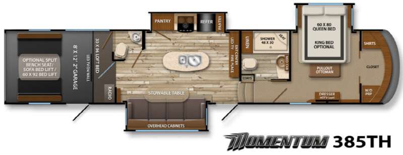 This Grand Design Momentum toy hauler fifth wheel has everything you need to take the fun up a notch or two! Featuring triple slides, one and a half baths, a kitchen island, and a 8' x 12' garage space for your toys!