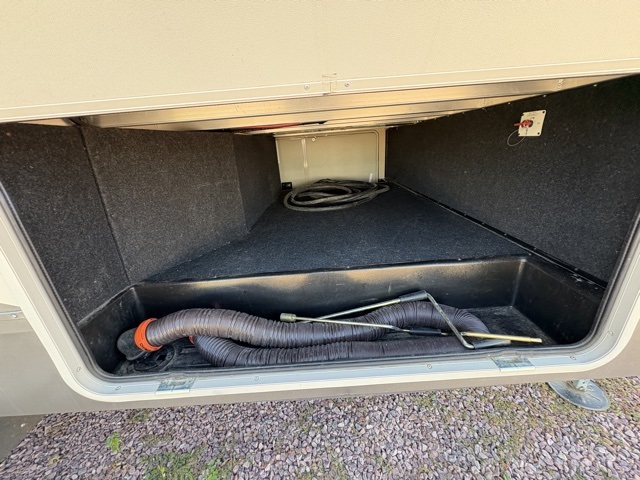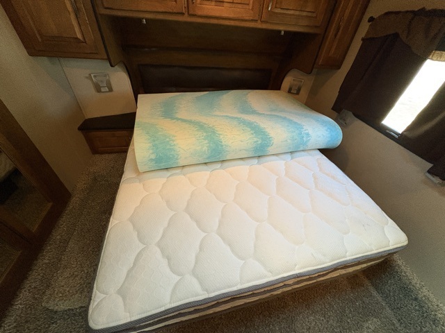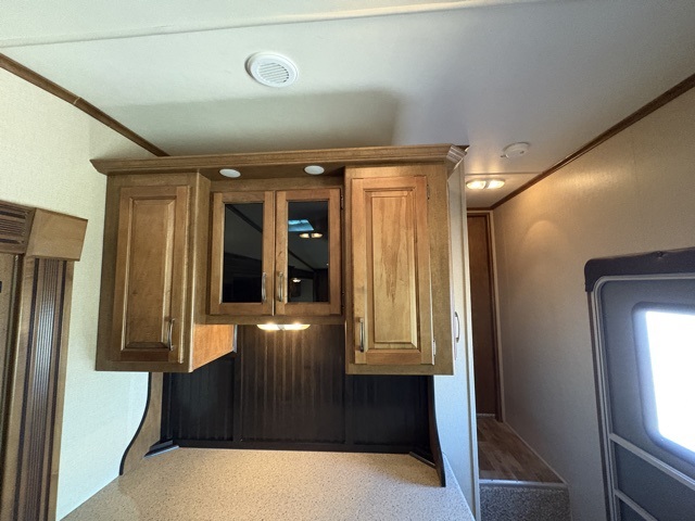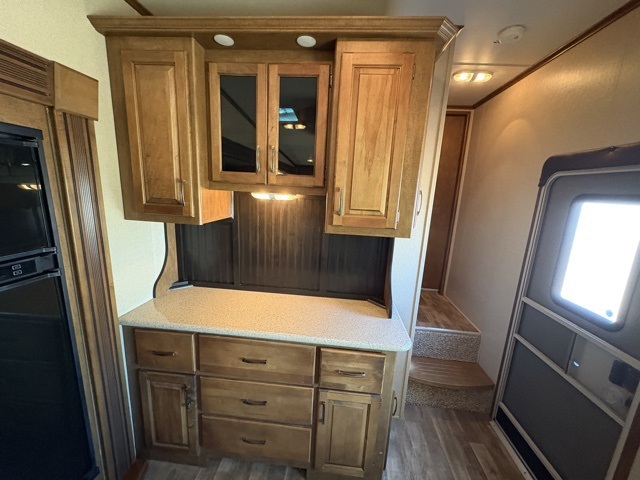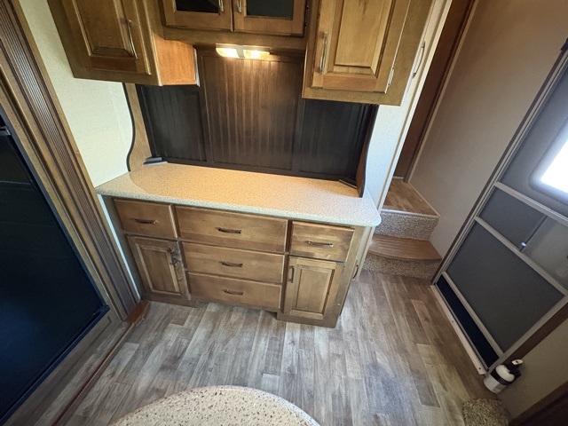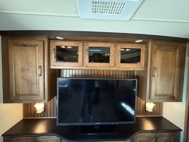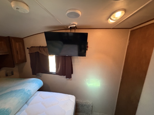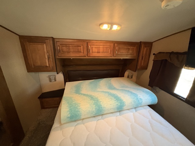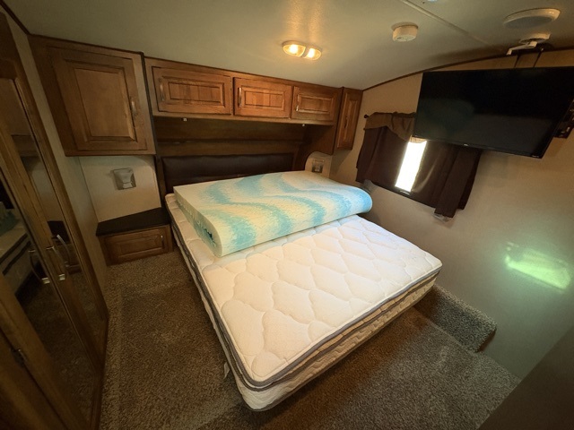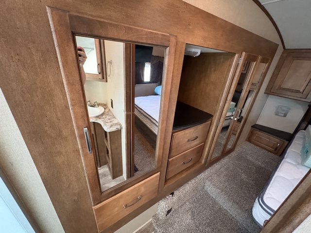 The bedroom features a comfy queen bed with overhead storage cabinets and additional storage on both sides of the bed. There is also a wardrobe slide with chest including the bath linen cabinet on the far end, and much more!