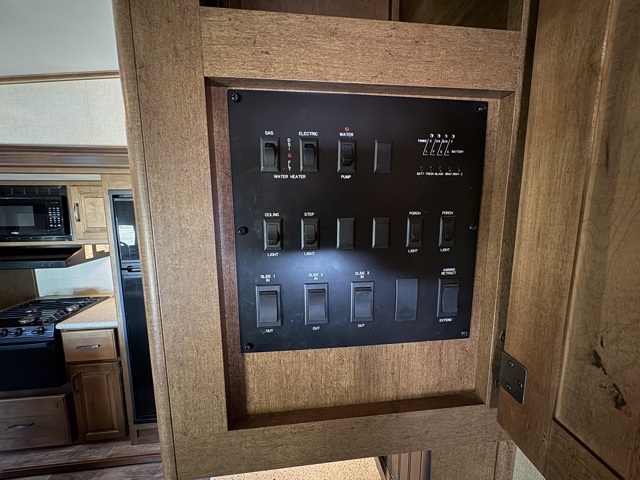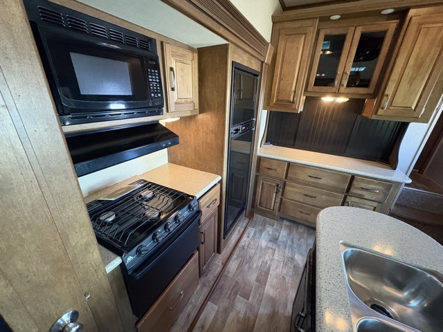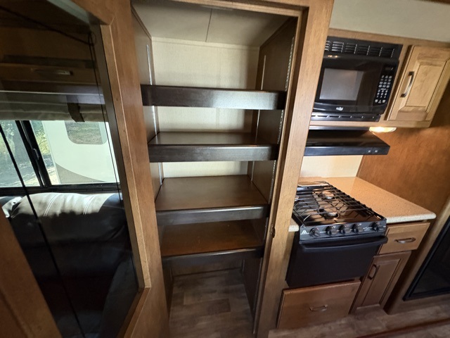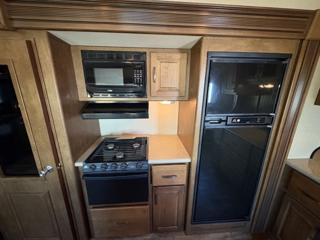 The opposite side of this Reflection unit features a slide-out refrigerator, three burner range with overhead, pantry, and hide-a-bed sofa with overhead storage.