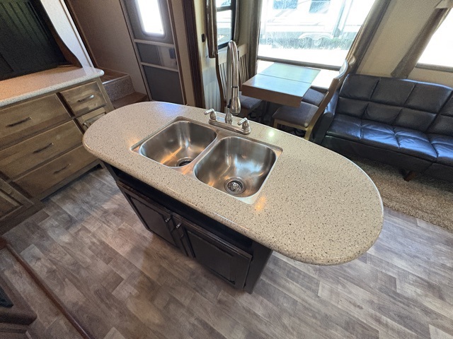 Straight in the door there is a hutch with overhead storage. A kitchen island in the center provides a double sink for convenient food prep and cleanup.