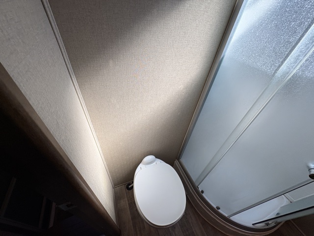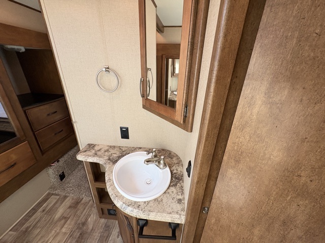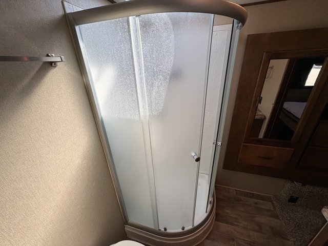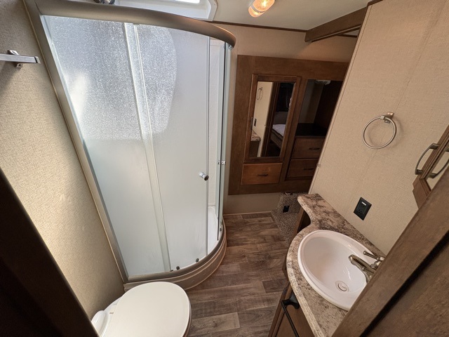 Step up to a side aisle bath and master bedroom suite. The bathroom features a corner shower, toilet, and vanity with sink. The bath has dual entry from the hall or from within the bedroom. It also has access to the linen cabinet that is in the bedroom slide out.