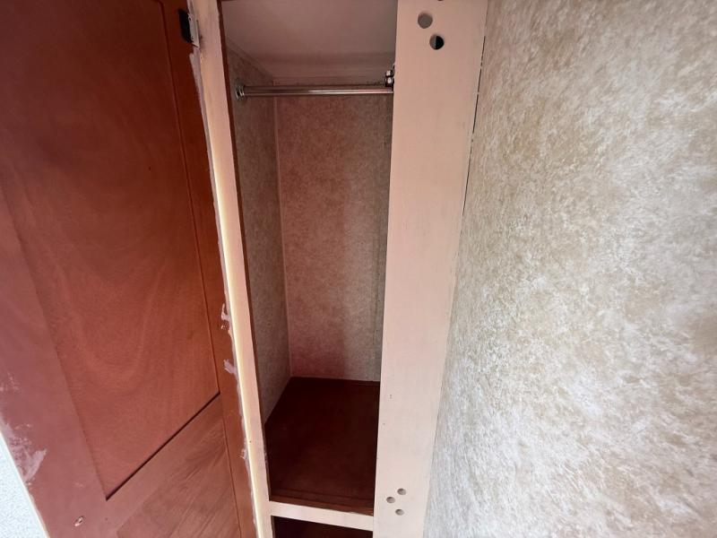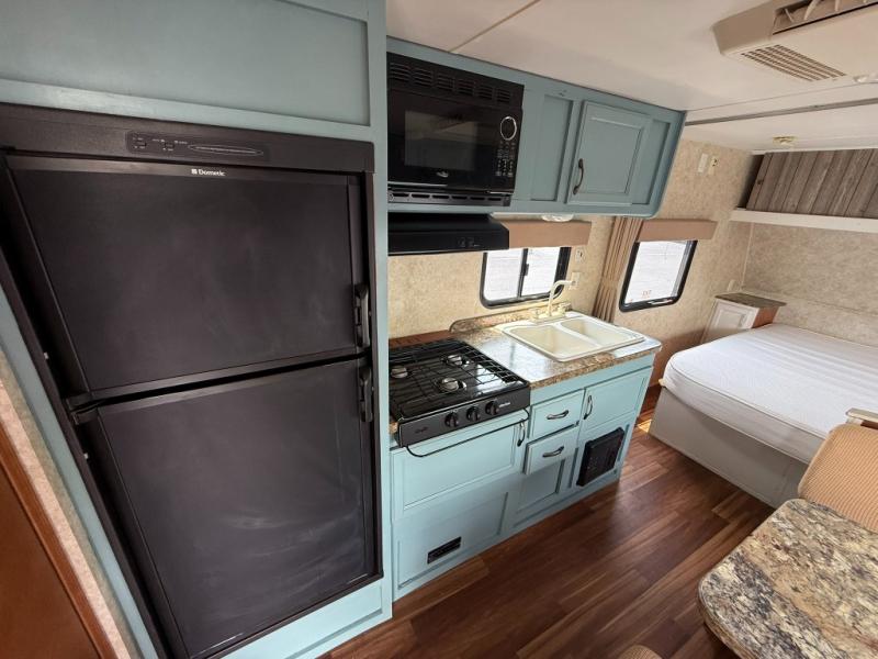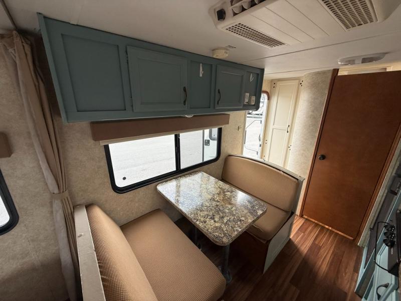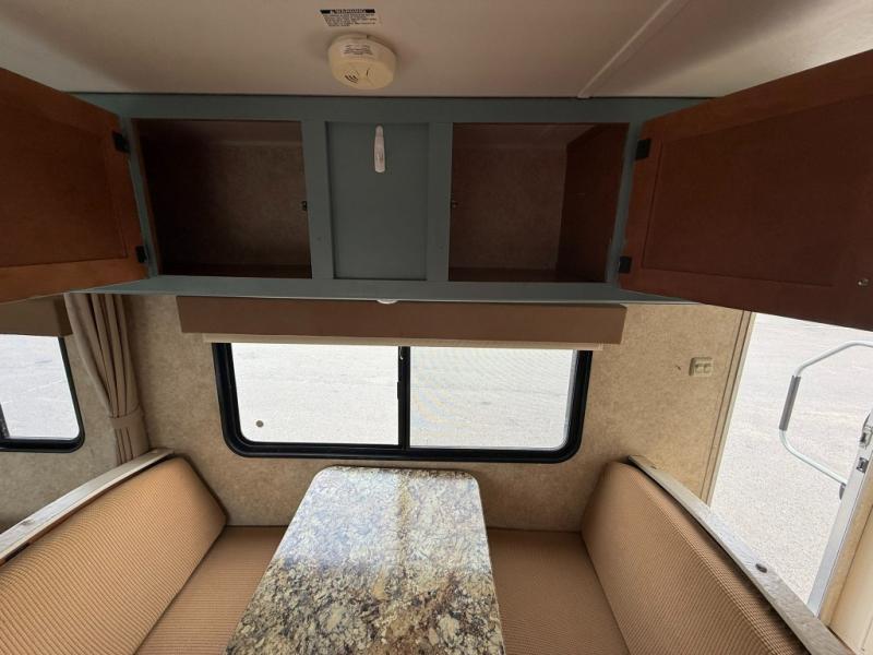 The kitchen provides everything you need to prepare and cook light meals and snacks with a refrigerator, three burner range, and double kitchen sink. There is a booth dinette on the opposite side of the room, and overhead cabinets throughout for storage.