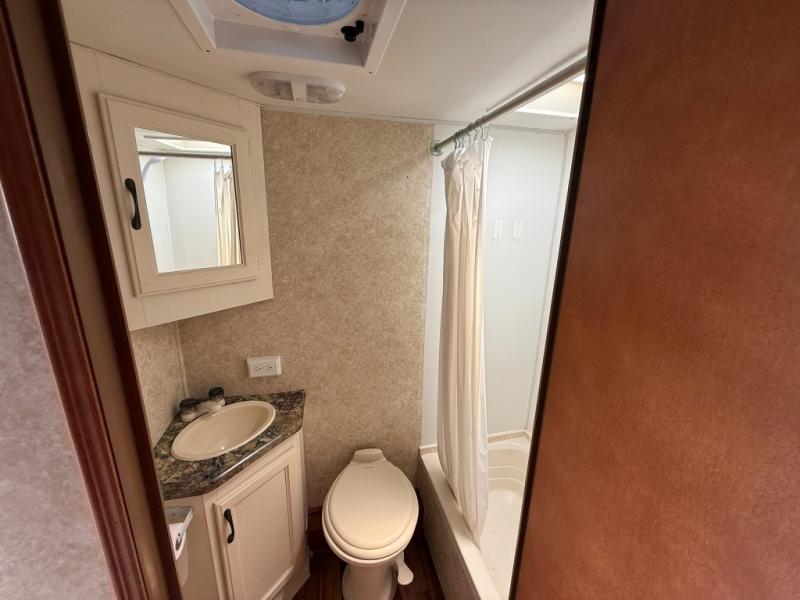 This Ameri-Lite 21MB by Gulf Stream Coach is similar to its cousin the 218MB. They are both the same length at 22'7", but this unit features a tub/shower in the bath rather than a neo-angle shower. It also features nightstands rather than wardrobes on either side of the front queen bed.