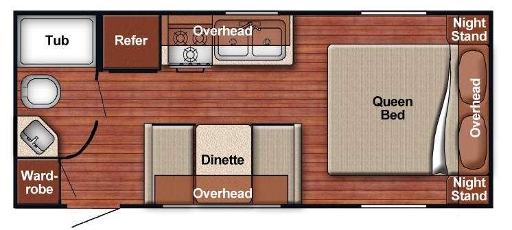 The front features a queen size bed with nightstands on both sides of the bed, along with overhead cabinets as well.