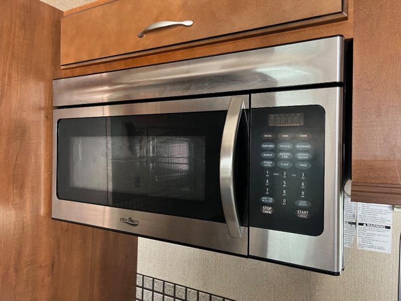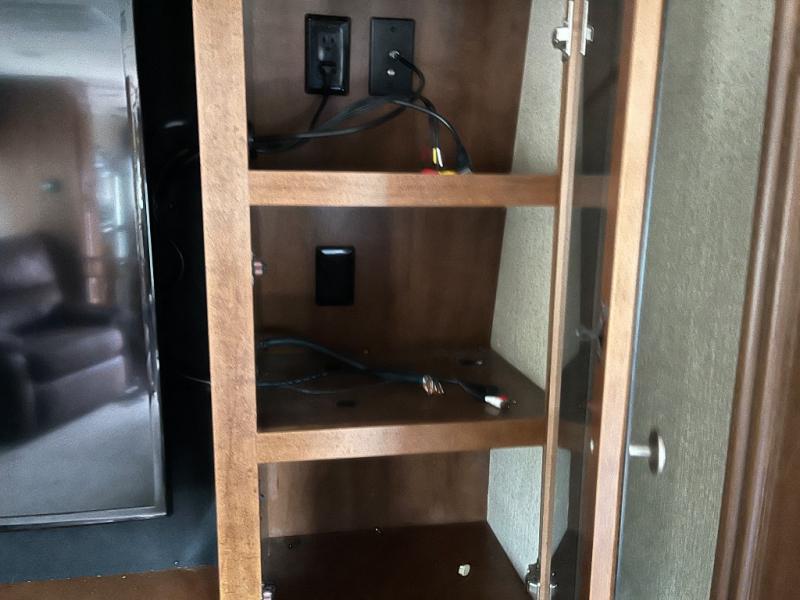 To the right of the entry door take the steps up to a front living space with dual slide-outs each including a sofa, a front wall entertainment center with storage, and a recliner also. This is the perfect place to enjoy watching TV, entertain guests, or just reminisce about your days adventures.