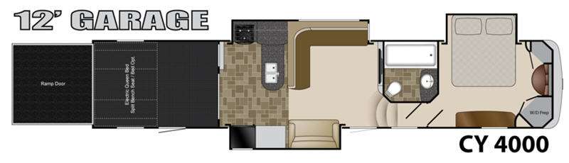 The rear ramp door will make loading and unloading a snap into Elite model 4000. Inside the cargo find a side man door, overhead loft area, and you can also choose the optional electric queen bed split bench seat/bed that your extra guests will enjoy. Plenty of seating during the day, and a great place to sleep at night.