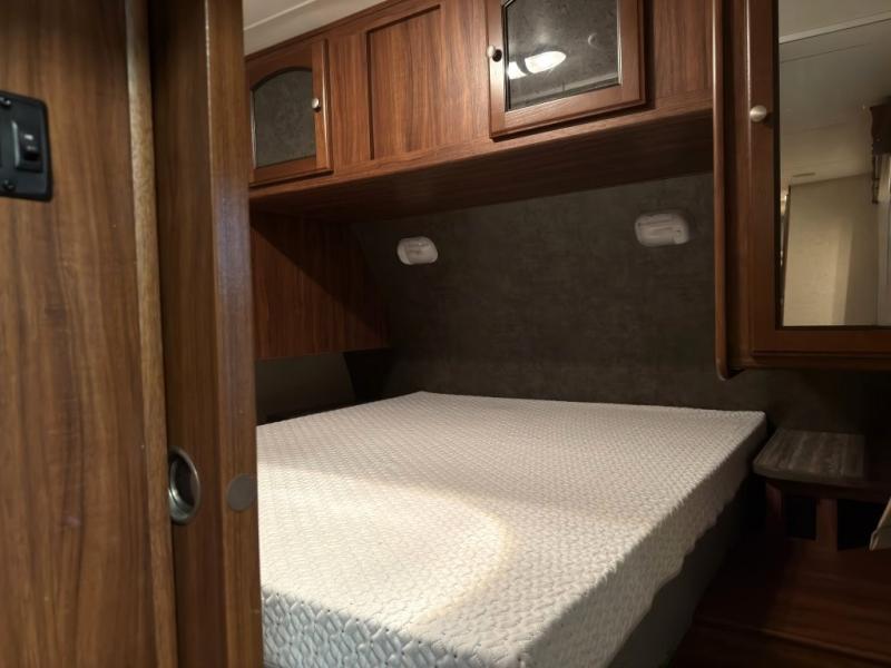 The front bedroom features a comfy queen size bed with storage on either side of the bed, and overhead storage as well.