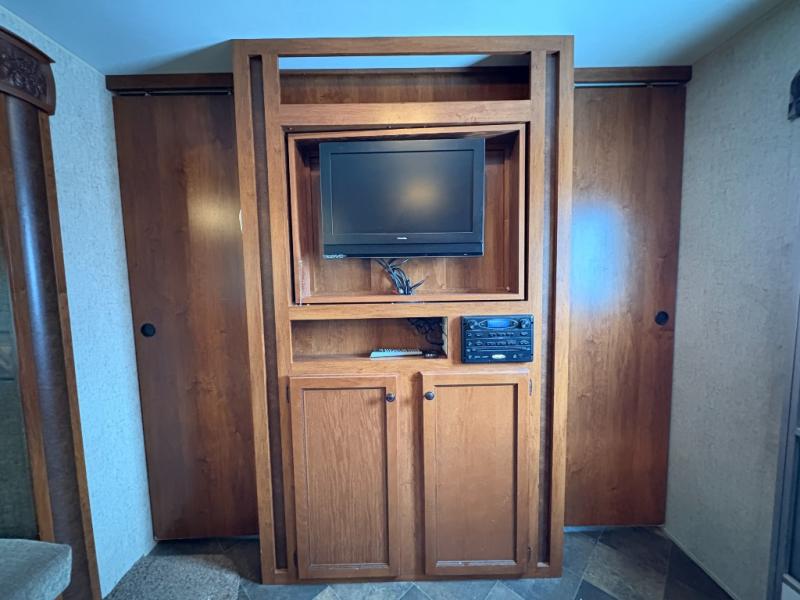 Step inside model 30ODK and see a private front bedroom with dual entry doors on either side of the entertainment center. There is a comfortable queen size bed with overhead storage, plus nightstands and shirt closets on both sides. The entertainment center features a swivel TV box so it can easily be viewed in the bedroom as well as the main living area.