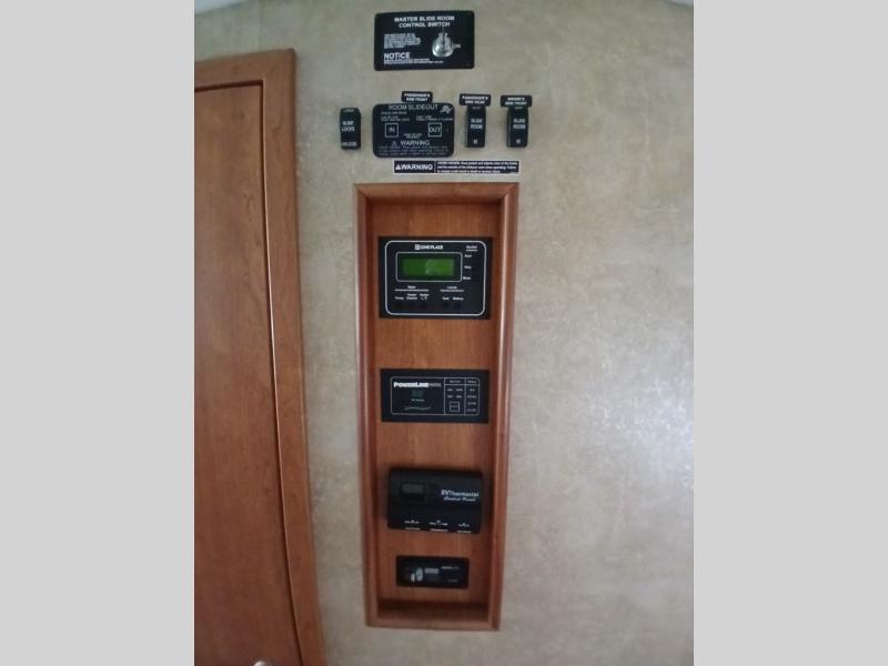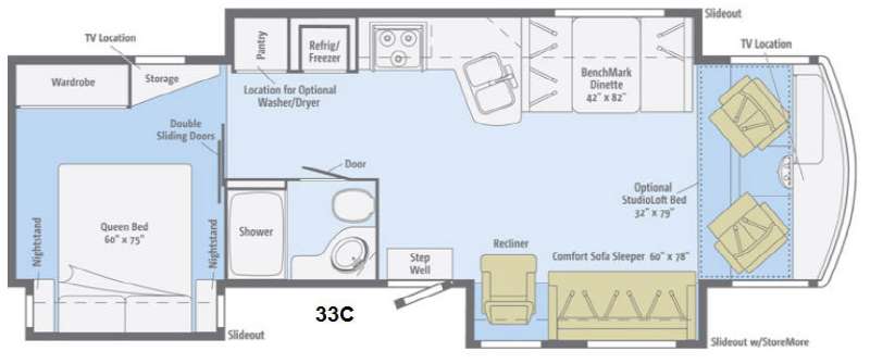 Triple Slide Sunova Class A Coach w/Rear Queen Bed w/Nightstands Slideout, Wardrobe/Storage, Dbl. Sliding Door, Bath w/Shower, Vanity w/Sink & Toilet, Pantry/Refrig./3 Burner Range/Dbl. Kitchen Sink & BenchMark Dinette Slide, TV Above Cab Area, Slideout Sofa Bed & Recliner and Much More! Available Options May Include: King Bed, Comfort Sofa Sleeper IPO Sofa Bed, Dining Table & Chairs w/Buffet & 40" LCD TV, Bedroom TV, Studio Loft Above Cab.