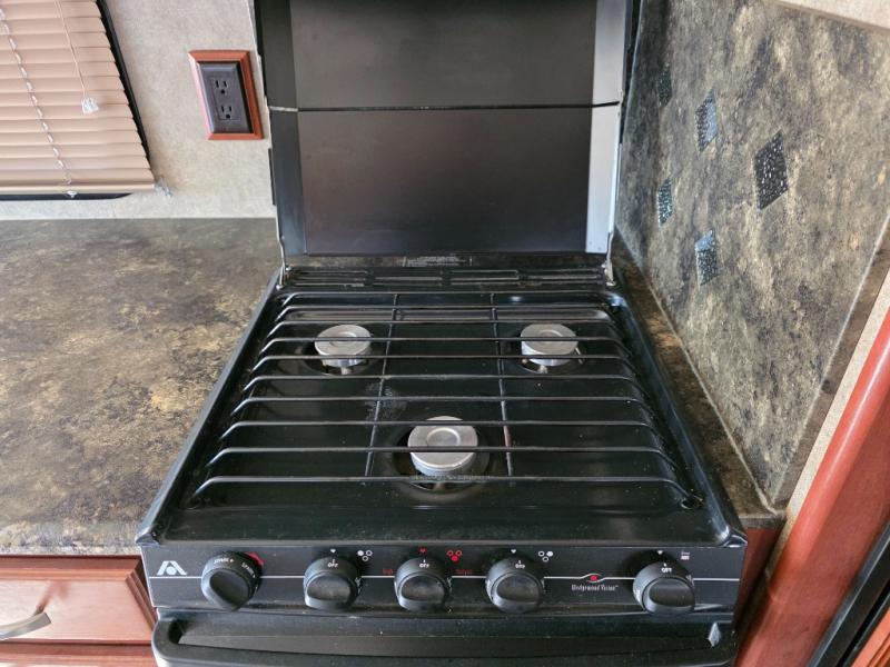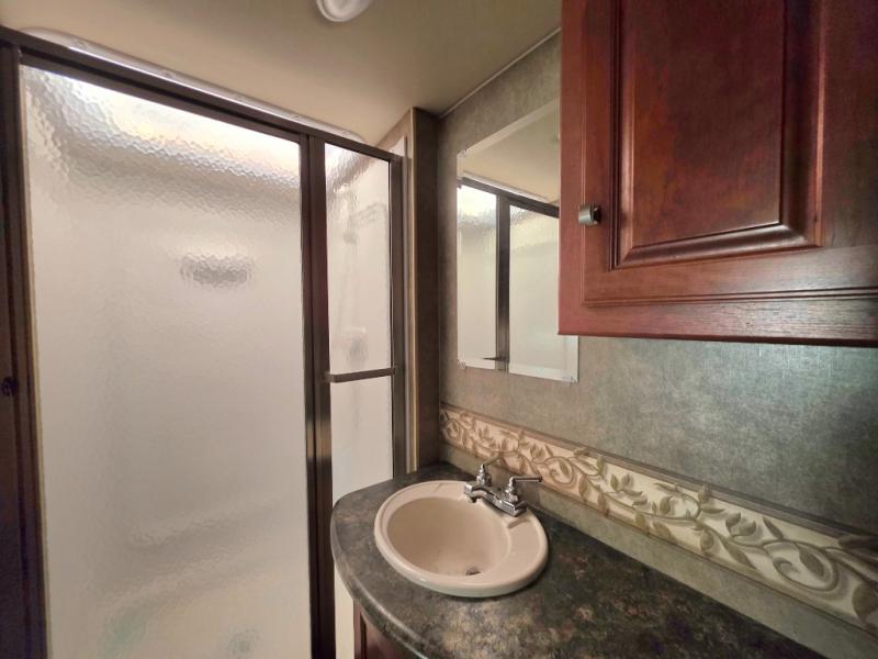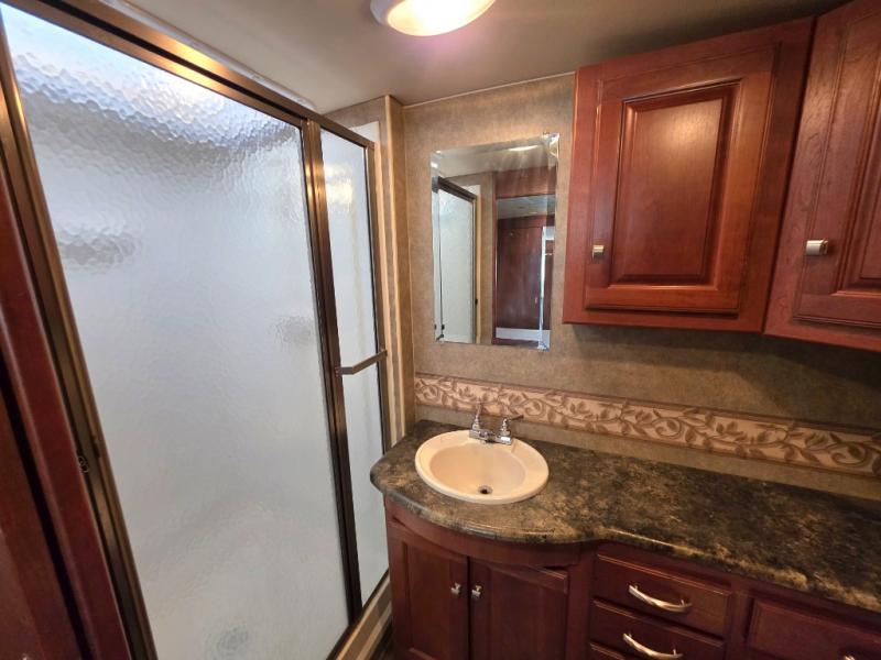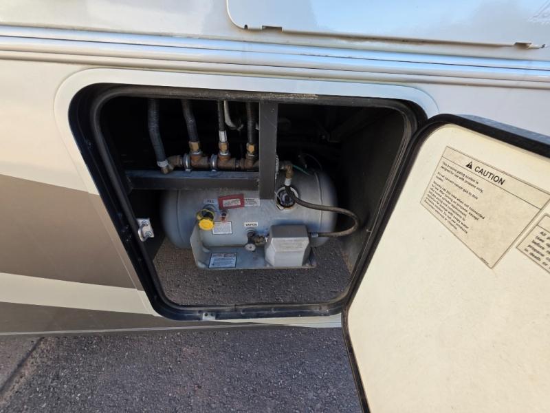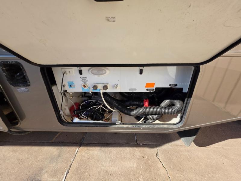 This Class A motor home has a Rear Full Bath Including Shower, Vanity w/Sink, Toilet & Overhead Cabinet, Sliding Door to Bedroom w/Slideout Queen Bed & Nightstands, Wardrobe/Chest of Drawers/Wardrobe, Sliding Door to Living Area, L-Shaped Extendable Sectional Sofa & Booth Dinette Slide, 1/2 Bath, 32" LCD TV, Refrig., 3 Burner Range, Dbl. Kitchen Sink and Much Much More!