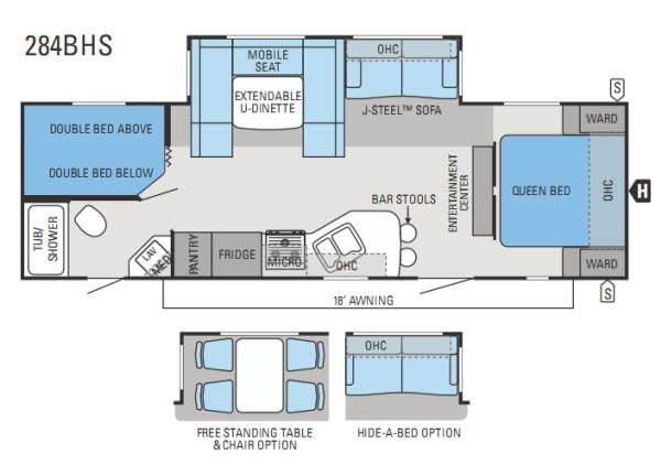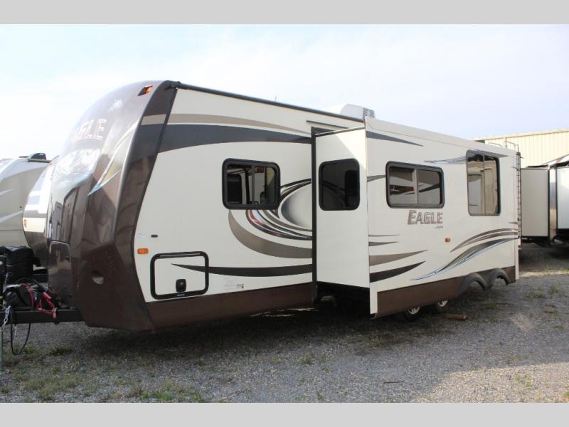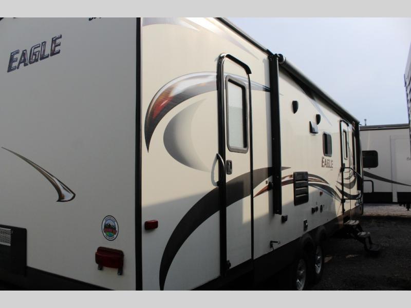 Single Slide Eagle Travel Trailer, Rear Dbl. Bunk Beds, Tub/Shower, Toilet, Lav., Med. Cab., Pantry, Refrigerator, 3-Burner Range, Dbl. Kitchen Sink, Bar Stools, Extendable U-Dinette/J-Steel Sofa Slide, Entertainment Center, Queen Bed, Dbl. Wardrobes, Overhead Cabinets Throughout & Much More. Available Options May Include: Free-Standing Table & Chairs, Hide-a-Bed.
