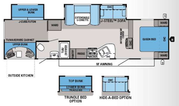 As you enter the travel trailer, to the left is a double kitchen sink, three burner range, microwave, refrigerator, and pantry. The opposite side of the travel trailer offers a slide with an extendable u-dinette and a j-steel sofa. Next to the sofa is an entertainment center and a bench.