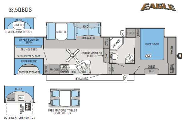 Double Slide Eagle Fifth Wheel, Rear Upper & Lower Bunk w/Trundle Bed, TV/Wardrobe Cabinet w/Bunk Above, Pantry, Refrigerator, Microwave, 3-Burner Range, Dbl. Kitchen Sink, Dinette/Sofa Slide, Ward. w/Shelves, Ent. Center, Step Up To Bed/Bath, Toilet, Shower, Lav., Linen/Chest/Queen Bed Slide, Wardrobe, Storage Shelves, Chest, Overhead Cabinets Throughout, Awning & Much More. Available Options May Include: Outside Kitchen, Free-Standing Table & Chairs, Rear Dinette.