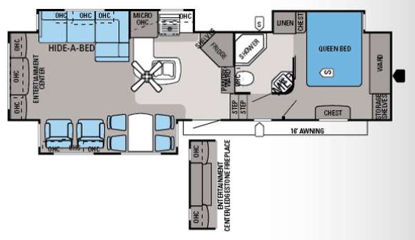 As you enter the 33 5RETS, to the left is a slide with a free-standing table and chairs, and two recliners. Along the rear wall is an entertainment center. The other slide has a hide-a-bed, microwave, and three burner range. There is a corner refrigerator and a pantry and wardrobe.