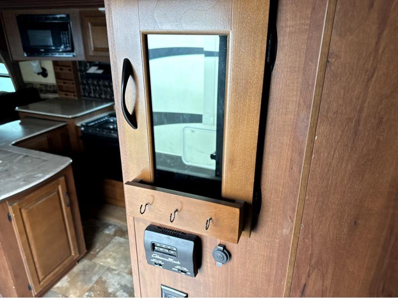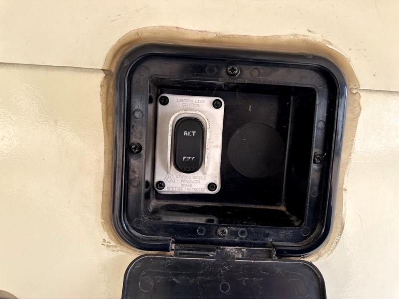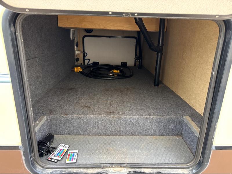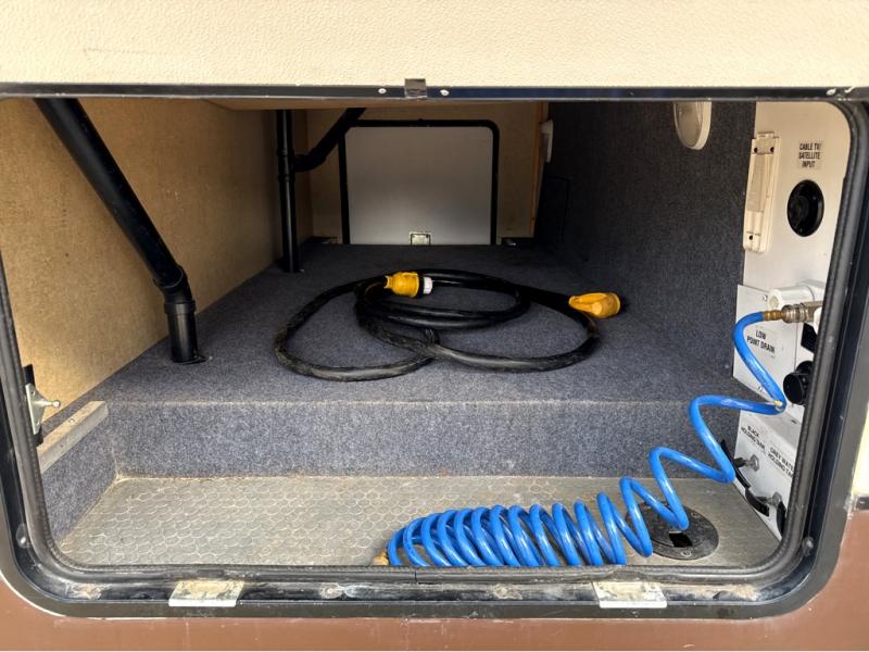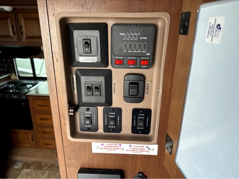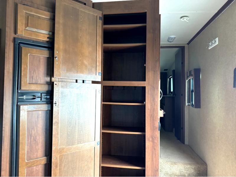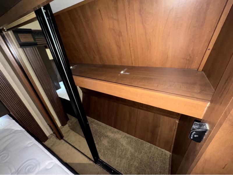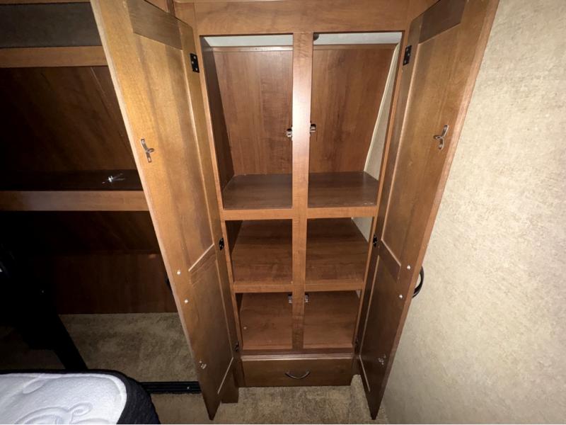 The front bedroom has a slide with a queen bed, chest, and linen cabinet. In the front of the bedroom you will find a large wardrobe, storage shelves, and a chest of drawers.