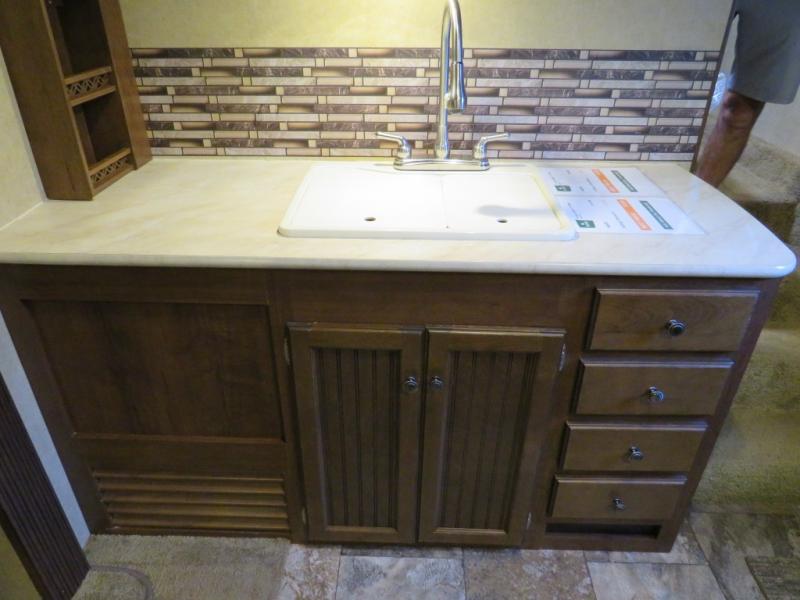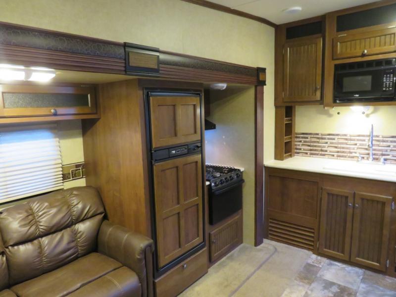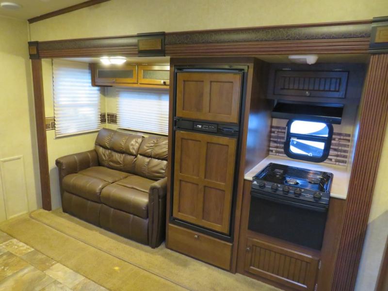 As you enter the fifth wheel, to the left is a dinette and entertainment center. Along one side you will find a slide with a hide-a-bed, refrigerator, and three burner range. In the front of the kitchen there is a double kitchen sink and lots of counter space.