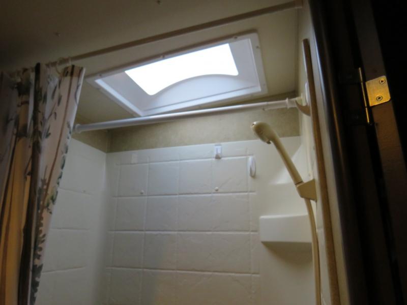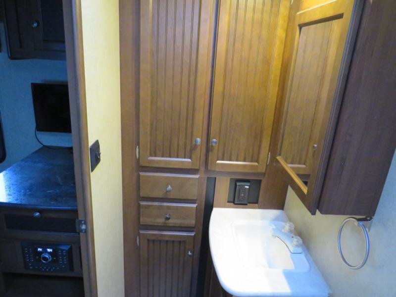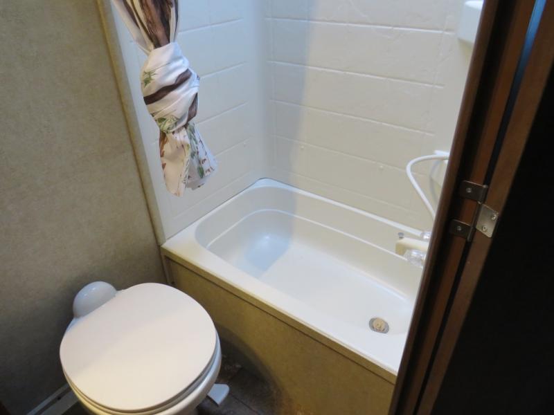 The bathroom is located in the rear of the fifth wheel. Inside the bathroom you will find a tub/shower, toilet, sink, medicine cabinet, and wardrobe.