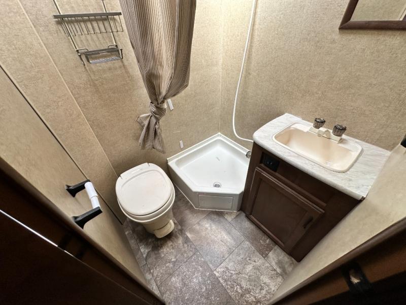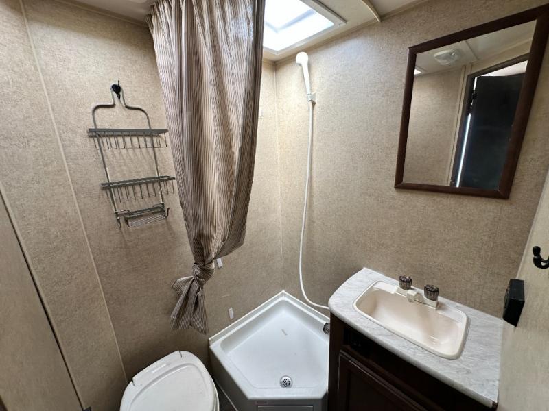 The bathroom is located in the rear. You will find a toilet, corner shower, and sink.